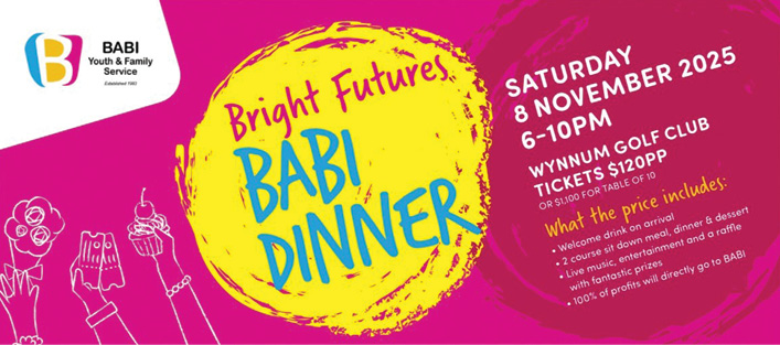 BABI Youth & Family Service is delighted to announce its inaugural Bright Futures Fundraising Dinner, to be held on Saturday 8 November 2025 at the Wynnum Golf Club (76 Stradbroke Avenue, Wynnum). Doors open at 6:00pm for a welcome drink, followed by dinner and entertainment.