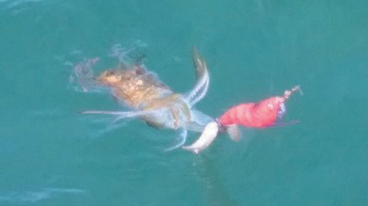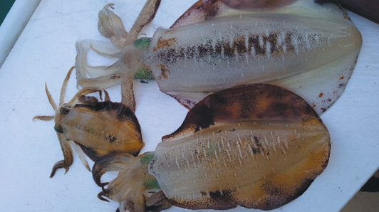 A little trick: when you catch them and lift them out of the water, grab between the head and body and turn the squid upside down so they release the water. That way, they can’t mix water with ink to squirt you, and please, don’t drag squid behind the boat to clean and remove the skin – it’s the best-tasting part of the squid.