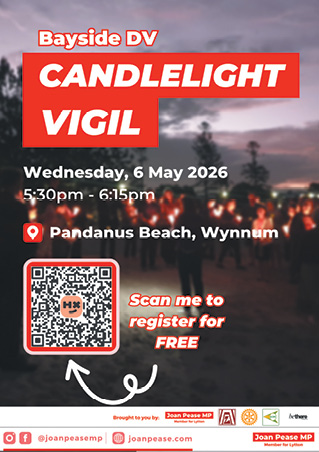 You are invited to attend the Bayside DV Candlelight Vigil on Wednesday 6 May and stand with our community against domestic and family violence. This vigil is about standing shoulder to shoulder – supporting those who have suffered and sending a clear message that violence has no place here. In Australia, 1 in 4 women have experienced violence by an intimate partner since the age of 15. Every candle represents a life, a story, and a call to action. I urge all Baysiders to come along, reflect, and show their support – because real change happens when communities unite and refuse to stay silent.