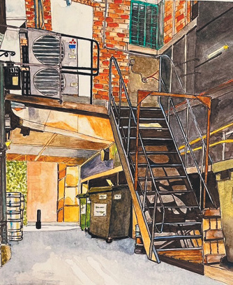 The urban sketching sessions are in the open air and can be seascapes, landscapes, houses, and built environments, or – tutor Angela Bruce’s favourite – industrial and back-street structures. As well as seeing the beauty in a rusty fire escape, Angela appreciates the finer things in life and insists that, in choosing locations for the sketching sessions, proximity to a good coffee shop is a prime consideration.