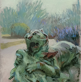 Her sculptures of dogs characteristically catch the animal in that exquisite moment between tension and movement, bringing into play her scientist’s focus and sensitivity to detail.