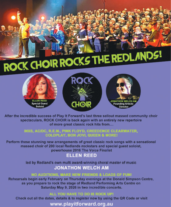 Jonathon Welch should know; Play It Forward, his vision and legacy for the future of inclusive arts programs, has for years been drawing people in for massed choir experiences, and in February, the second Rock Choir, with support from RPAC and Redland City Council, will be launched in the Redlands.