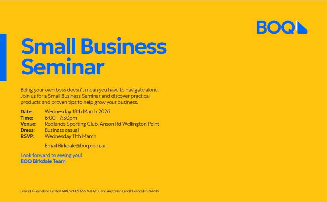 As part of our ongoing commitment to supporting local businesses, BOQ is hosting a Small Business Seminar on Wednesday, 18 March 2026 at the Redlands Sporting Club.