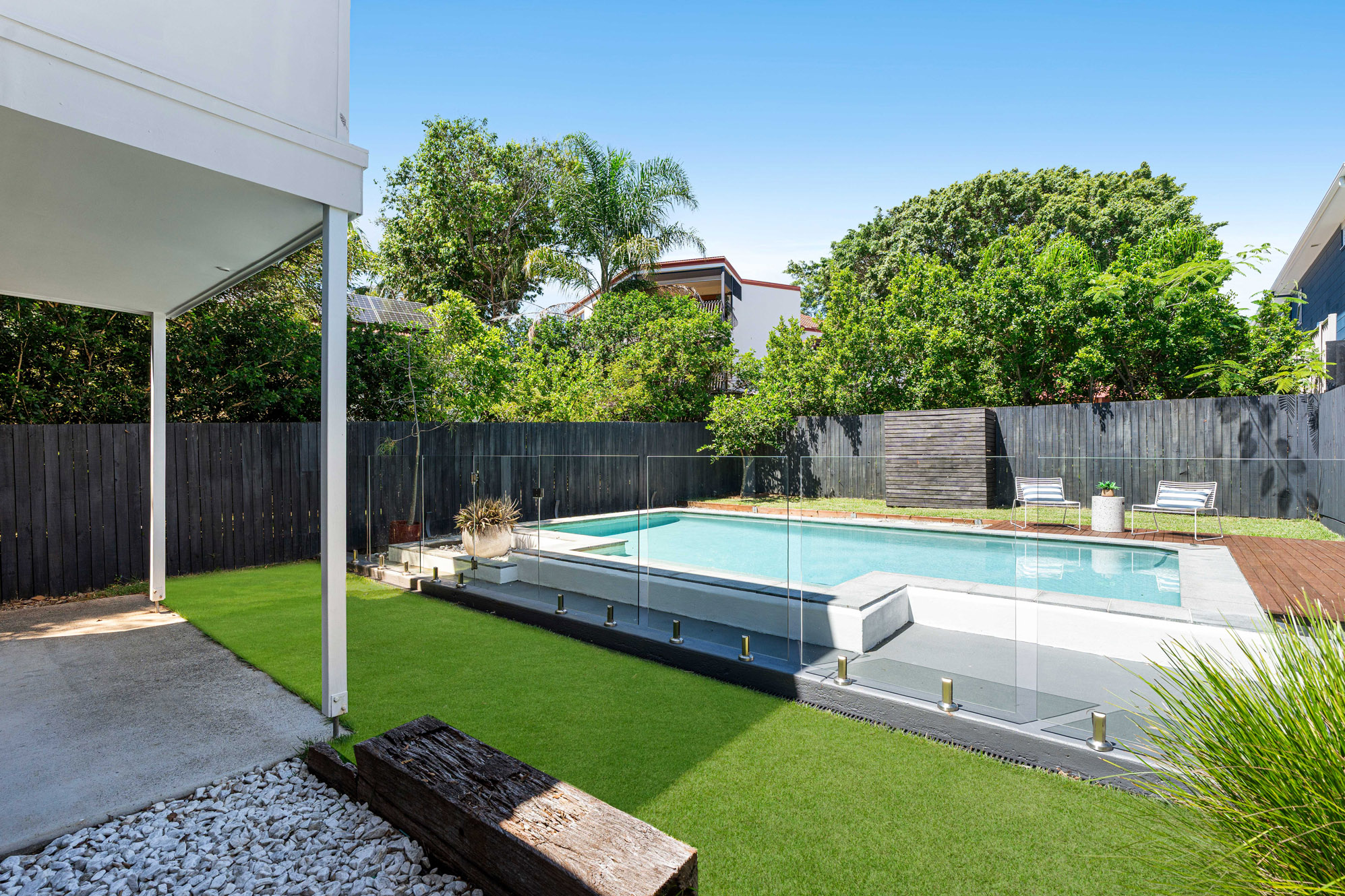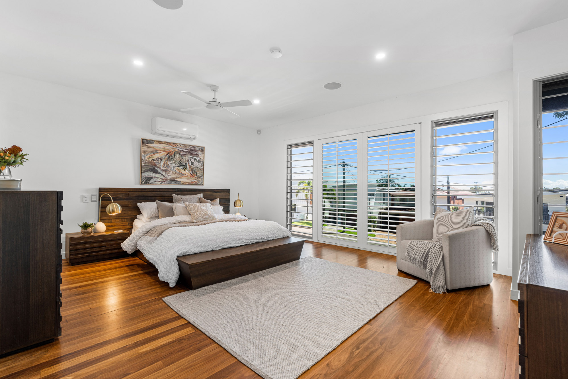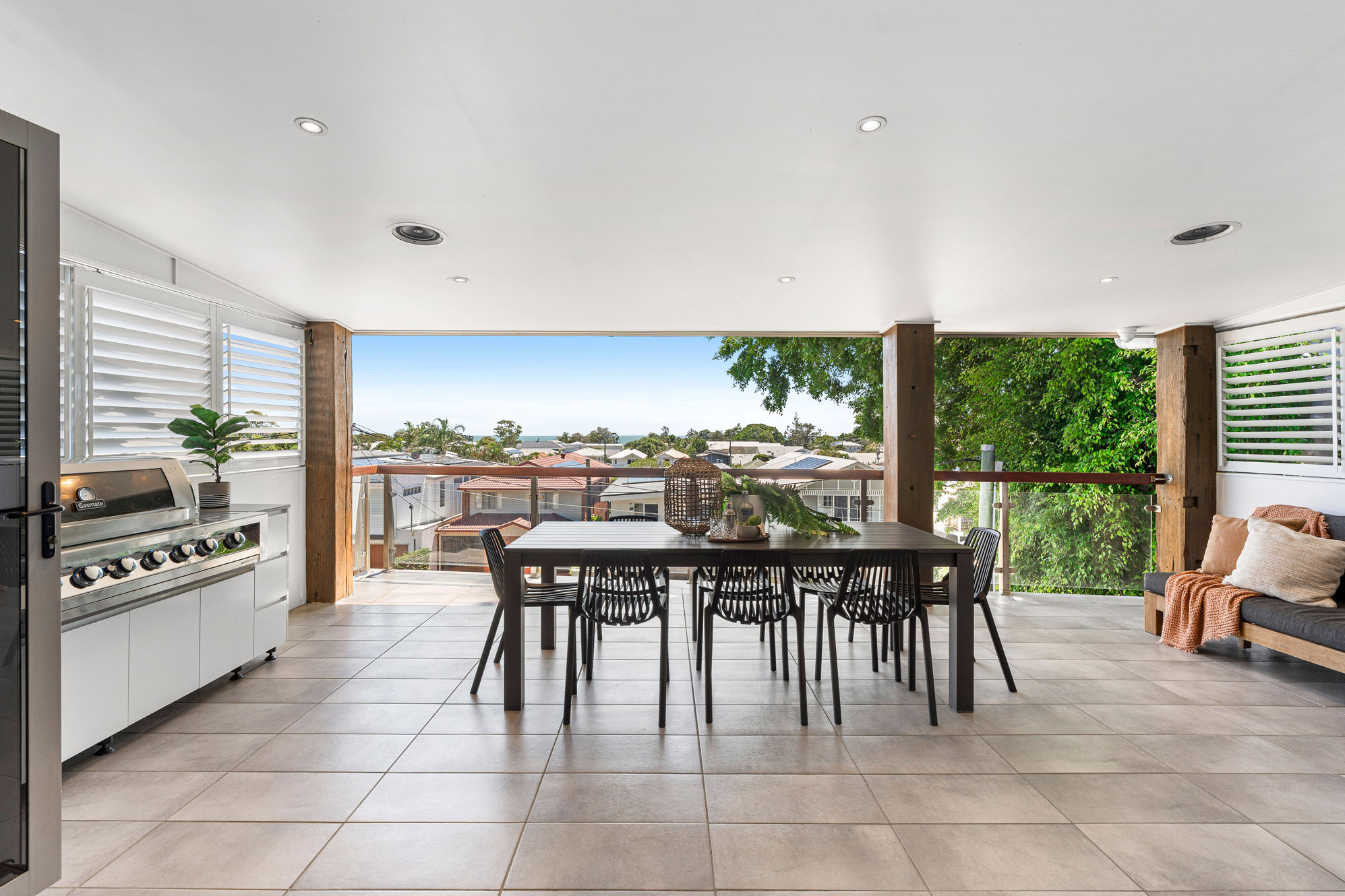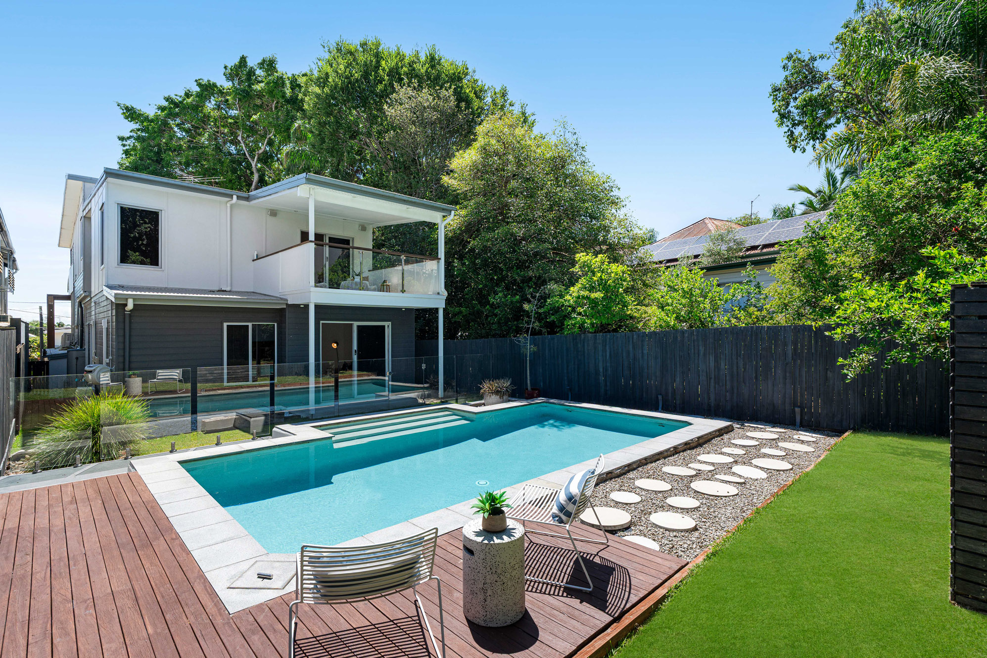 This stunning four-bedroom (plus study), two-bathroom residence showcases the perfect balance of style, comfort and functionality in one of Brisbane’s most desirable addresses. Extremely private, boasting a premier north- east facing position and commanding panoramic views, the home presents an unrivalled opportunity for families seeking a low-maintenance lifestyle without compromising on space or sophistication. Unique in its architecture, the home has been meticulously designed to cater for modern living. Spanning over three levels of internal living space, the home can accommodate families of all sizes. Upstairs, polished natural timber floors flow throughout a free-flowing dining area, seamlessly connecting with the gourmet kitchen. Appointed with stainless steel appliances, gas cooktop and butler’s pantry, this culinary hub extends onto an expansive entertainer’s deck, where majestic views across the bay and skyline create an awe-inspiring backdrop for any occasion. On the lower level, is the lounge area which flows into the formal lounge, sliding doors connect to a private rear deck overlooking the inground pool and gardens, offering a blissful escape.