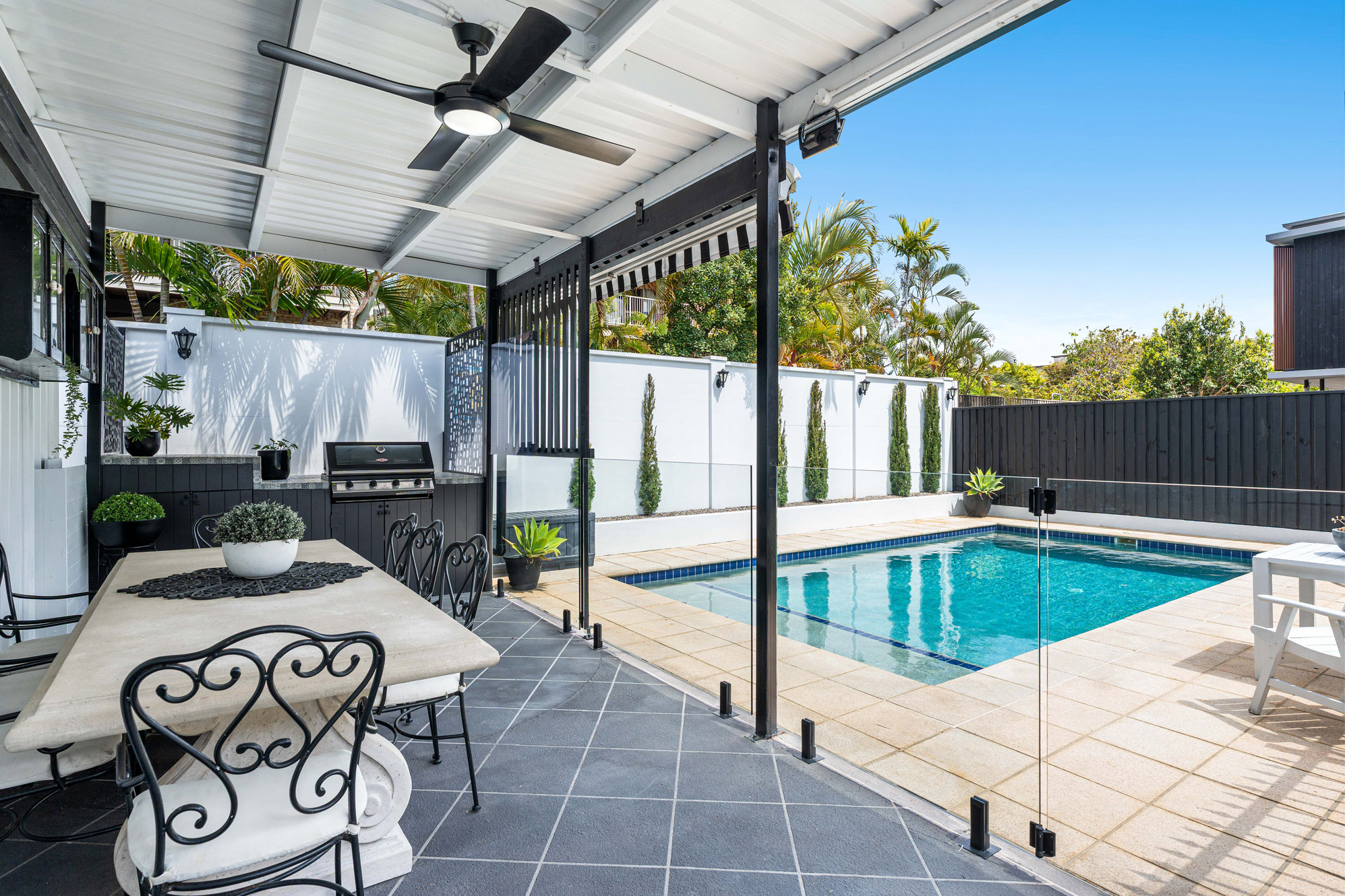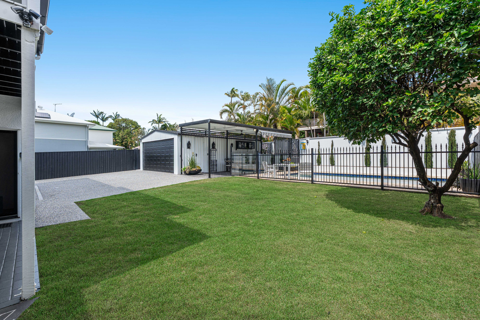From here, the outlook extends to the swimming pool, covered outdoor entertaining zone and a level, fenced lawn, a great spot to unwind, relax in your own private resort while kids can play in what is considered a large backyard.