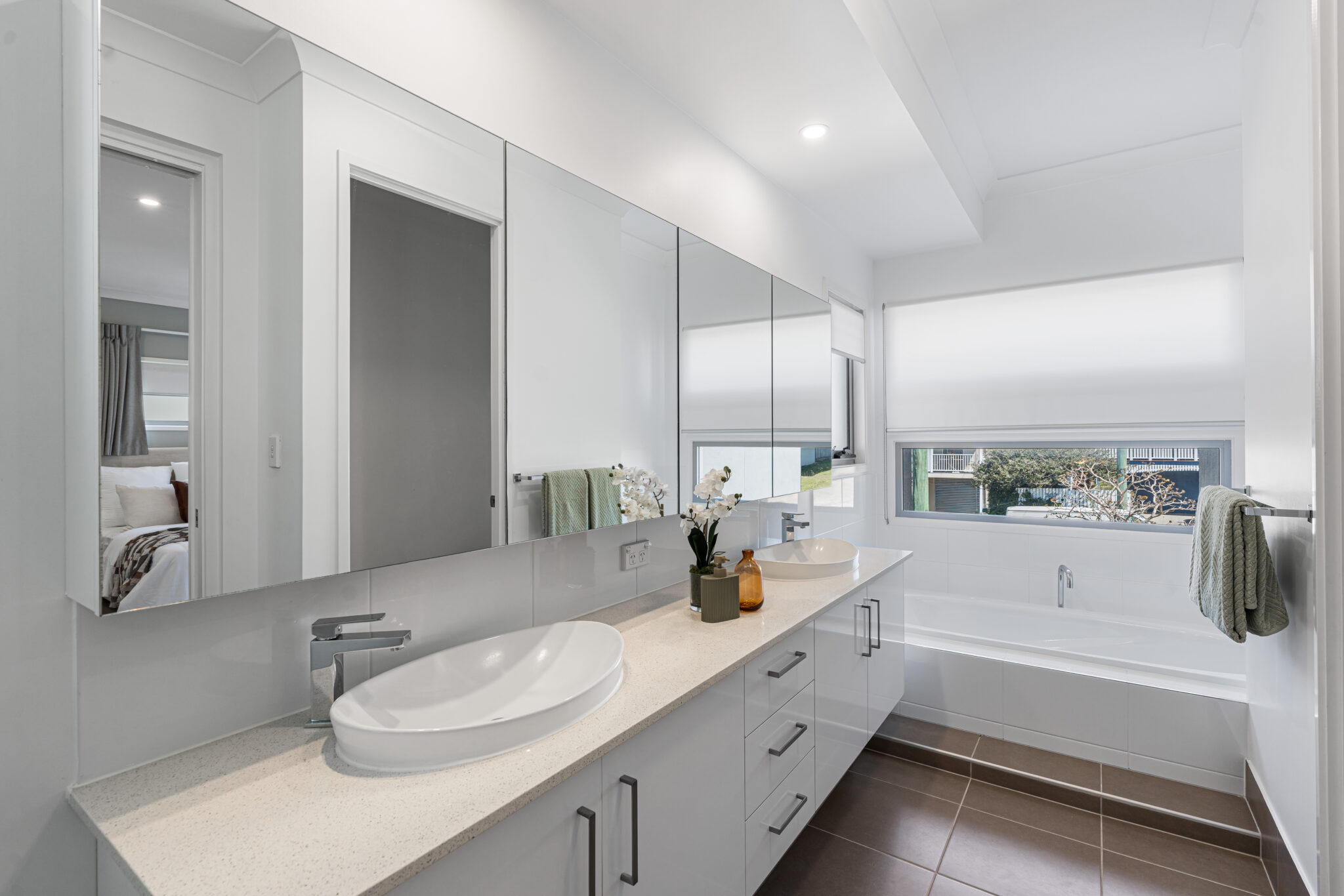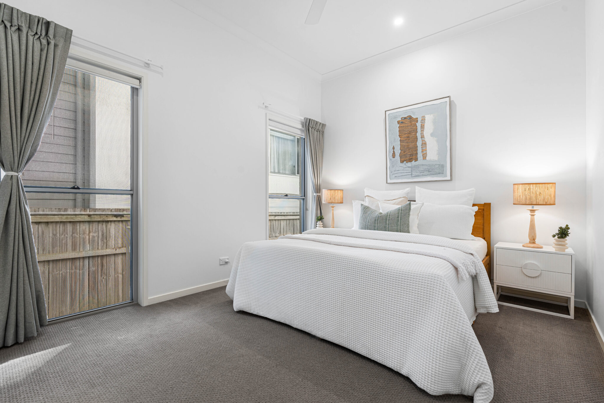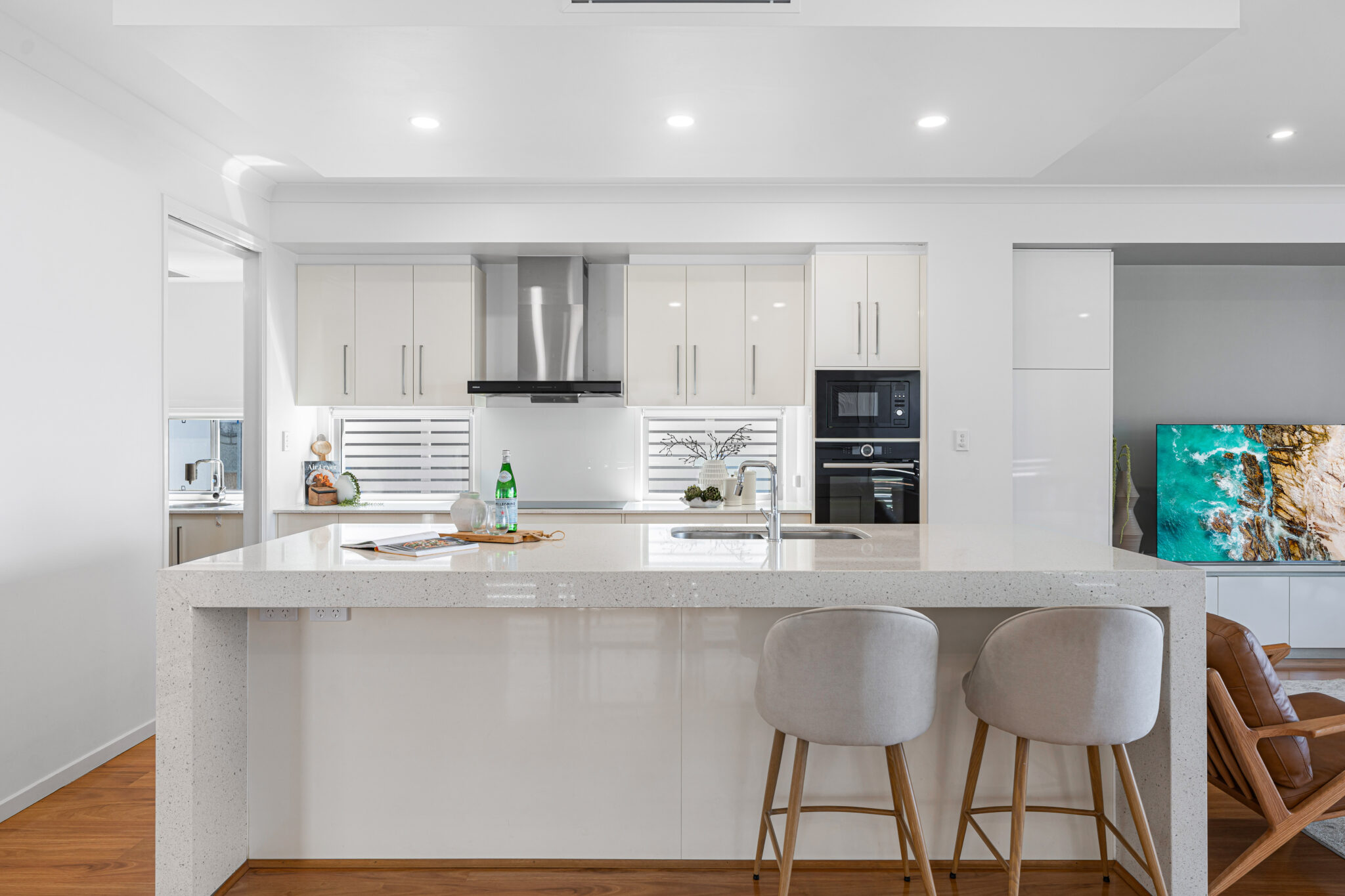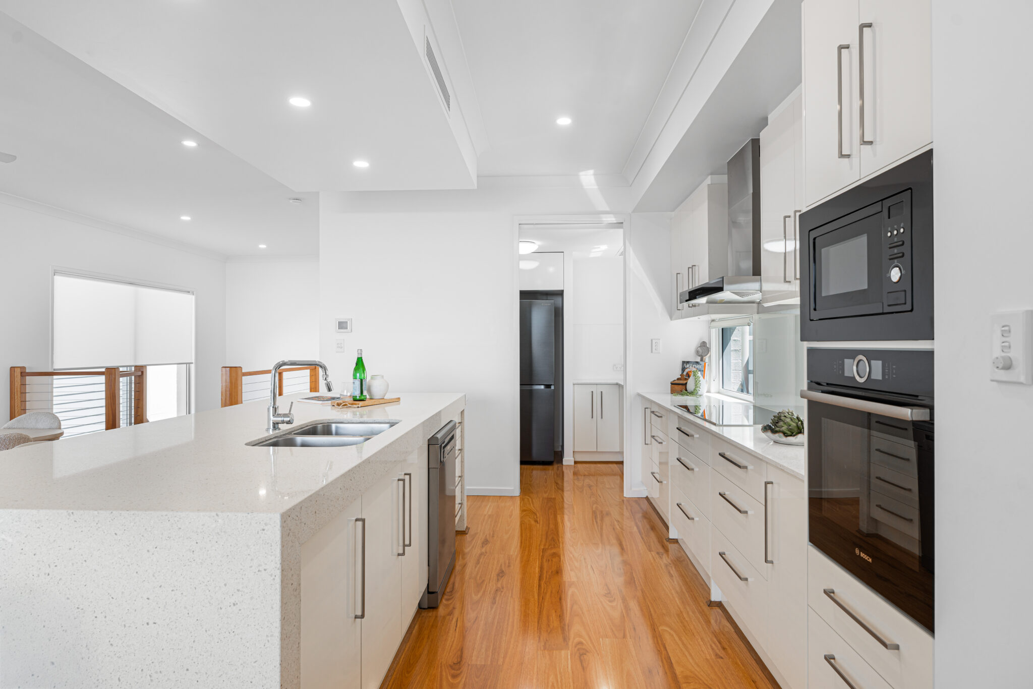 Stepping inside, you’re greeted by soaring 2.7-metre ceilings and striking timber flooring that flows throughout the lower and upper levels, creating a warm and refined atmosphere. The heart of the home is the expansive open-plan kitchen, complete with butler’s pantry, 900mm induction cooktop, stone bench tops and loads of cupboards space. Whether you’re preparing weekday dinners or hosting weekend gatherings, this kitchen is as functional as it is beautiful. The indoor spaces seamlessly connect with the north/ east-facing deck offering bay views, the upper and lower decks can be closed off to the elements thanks to a series of sliding windows perfect for all year round entertaining.