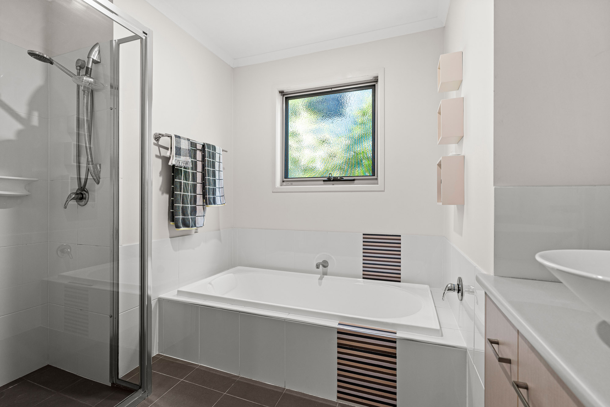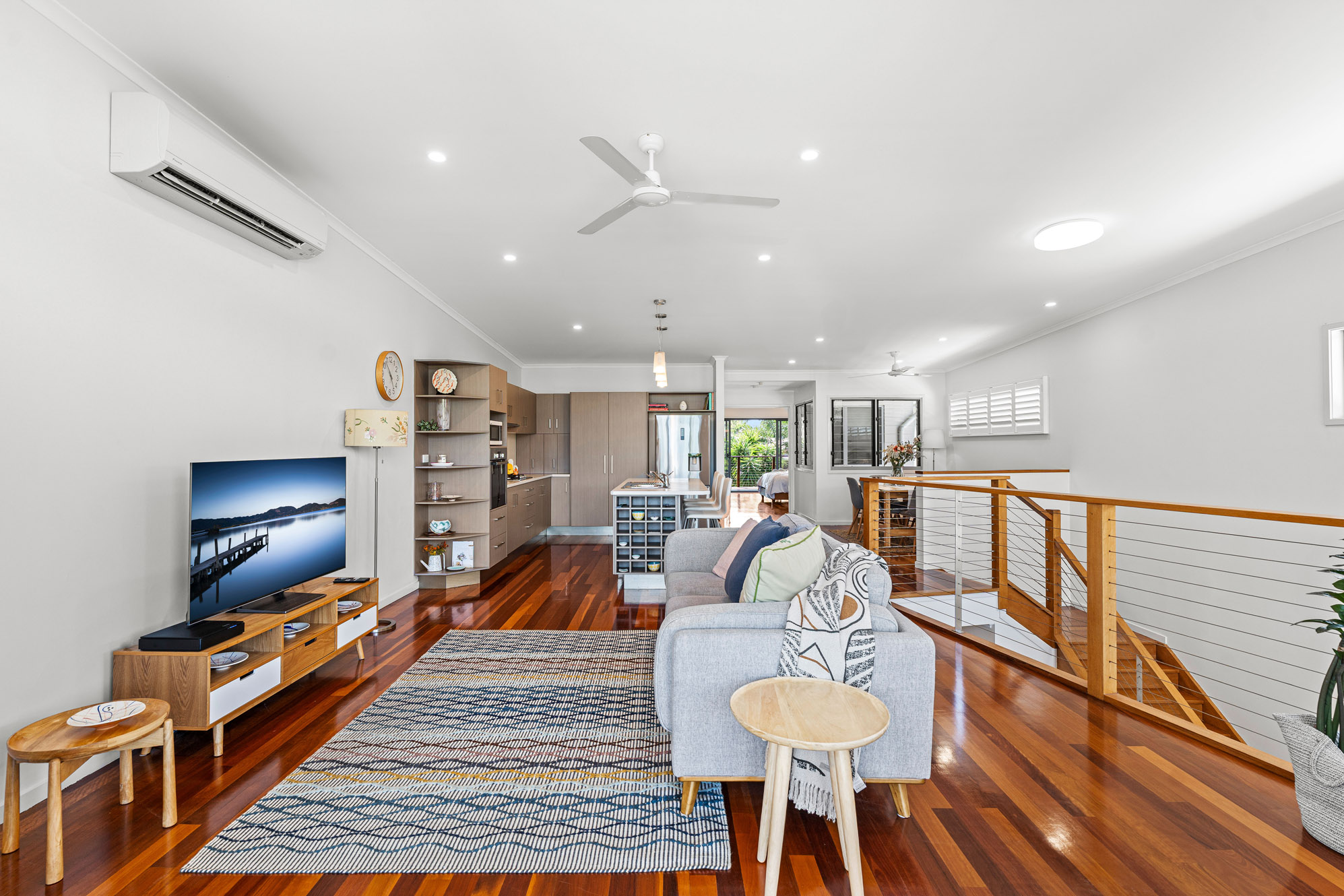 On its upper level, a spacious open-plan living and dining area feels bright and airy. Inviting you to relax and host guests with ease, this airy central area adjoins a superb kitchen displaying a breakfast bar, gas stove, dishwasher, glass splashback and ample cupboard storage. Extending the home’s entertainment options, a generous covered patio lends itself to barbecues, al fresco meals and afternoon drinks.