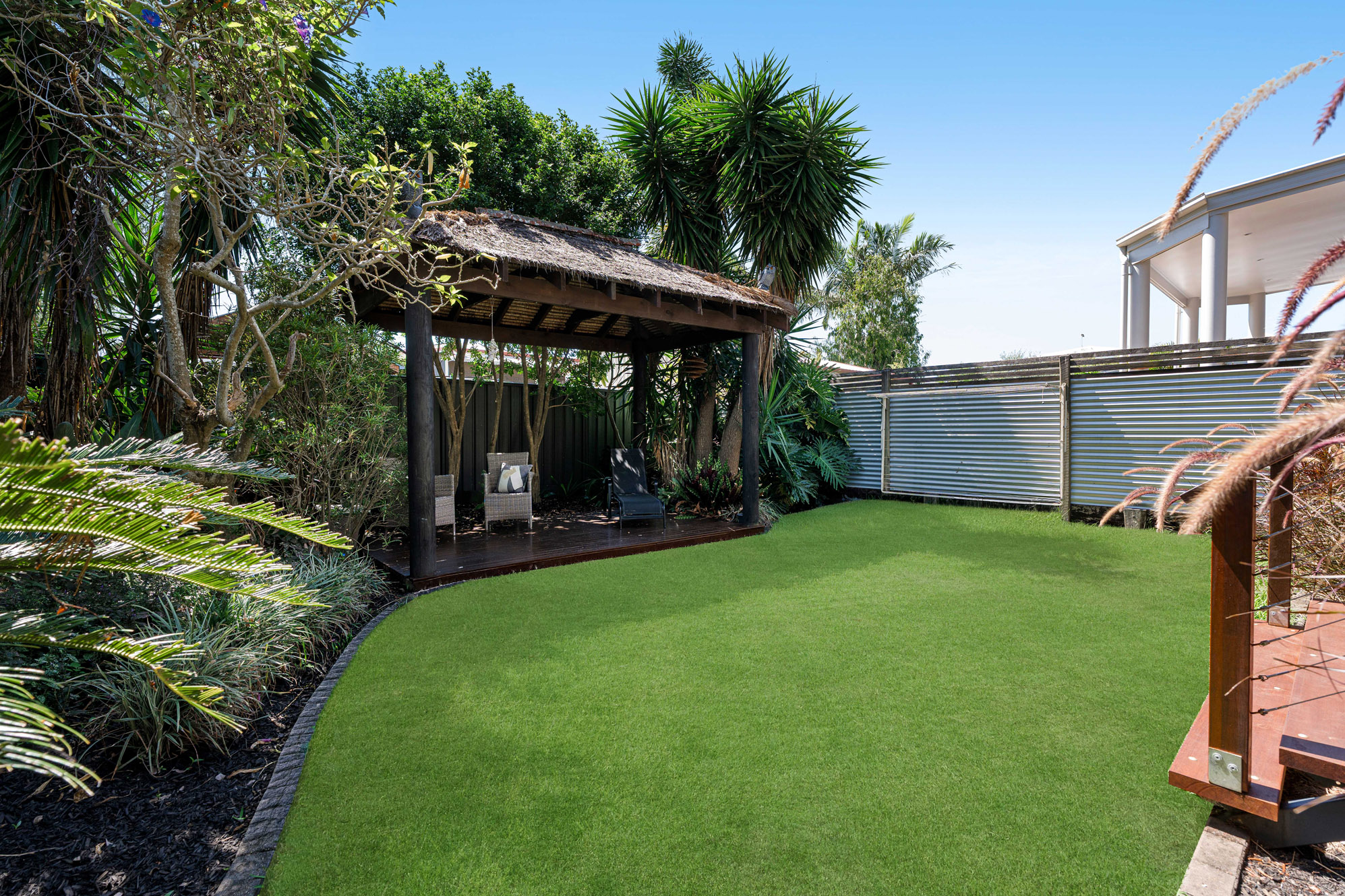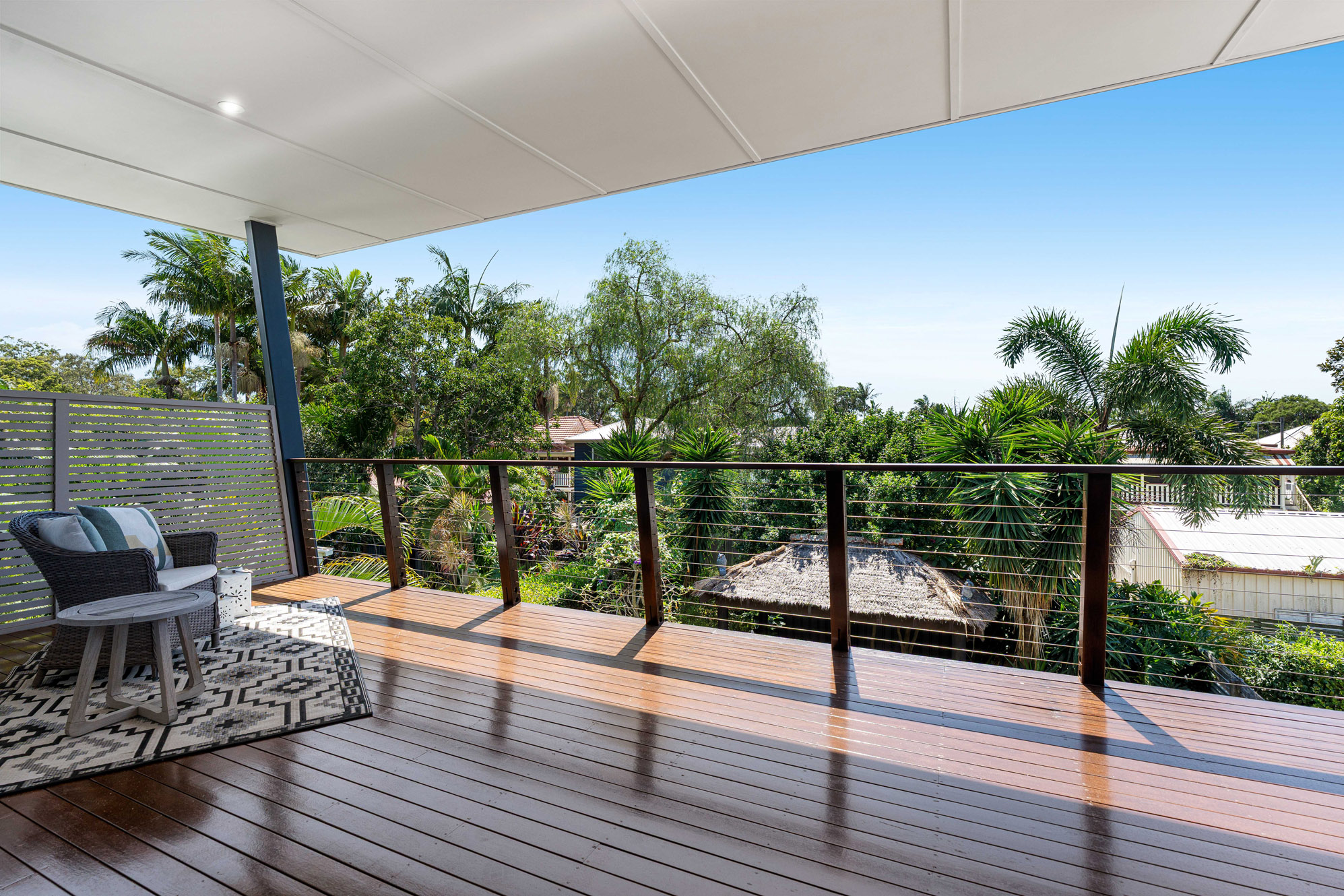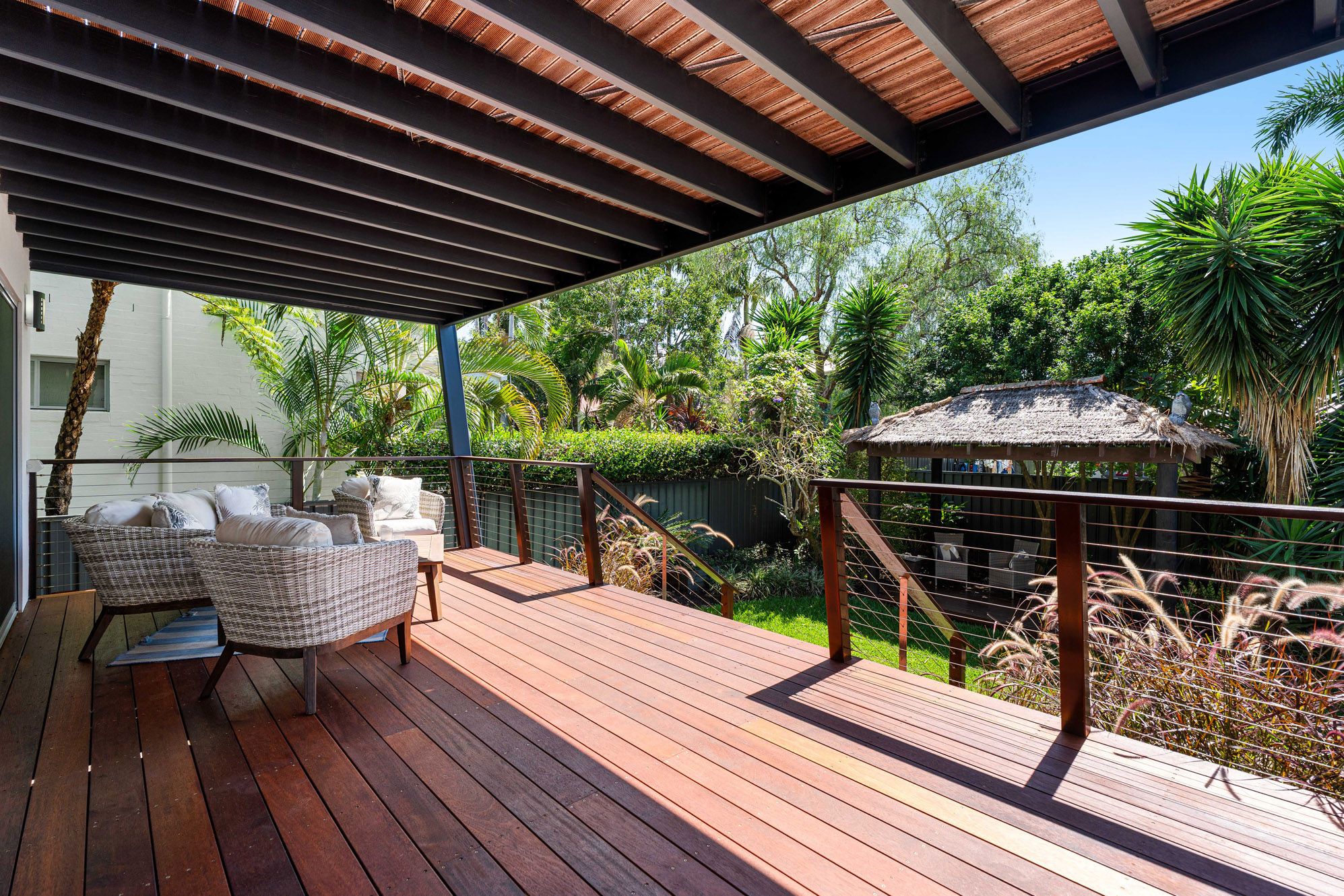 On the lower level two additional bedrooms, each with built-in robes, are serviced by a well-appointed main bathroom. One bedroom opens to a spacious under cover deck taking in a relaxed, mature tropical garden complete with a Bali hut. The large rumpus room also opens to this amazing vista. Those who work or study from home are not forgotten: The bright, extensive office area is ideal for those who need more than just a study nook.