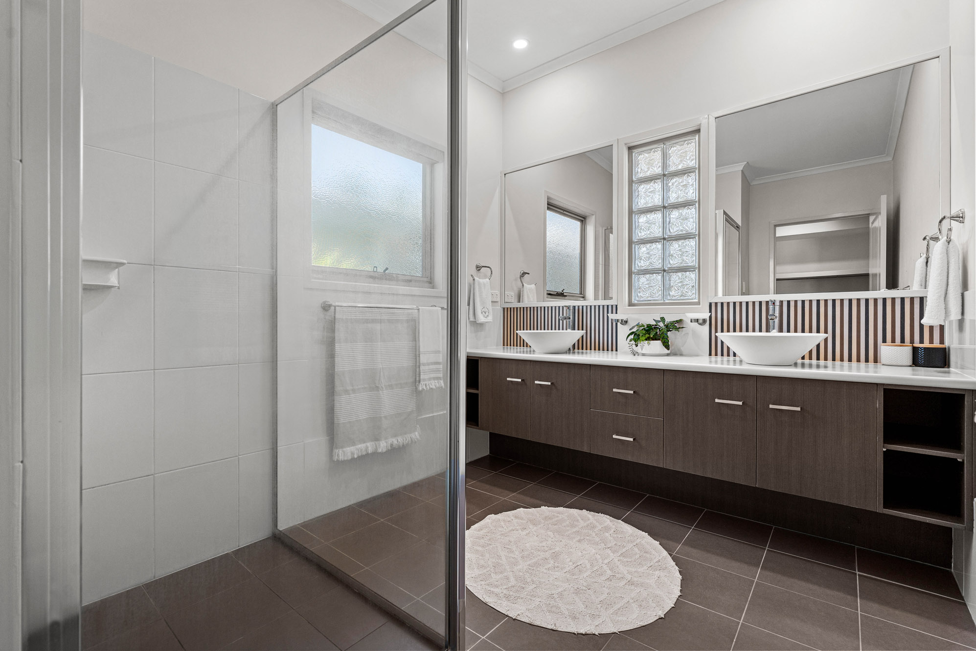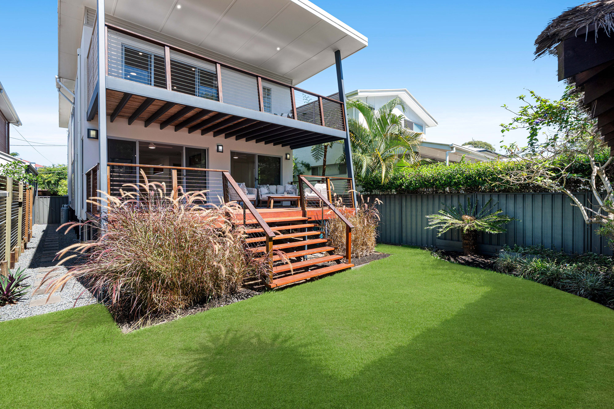 The main upper and lower areas of the home are linked to a louvred central light court, with a unique dual skillion roof design to capture the bay breezes.