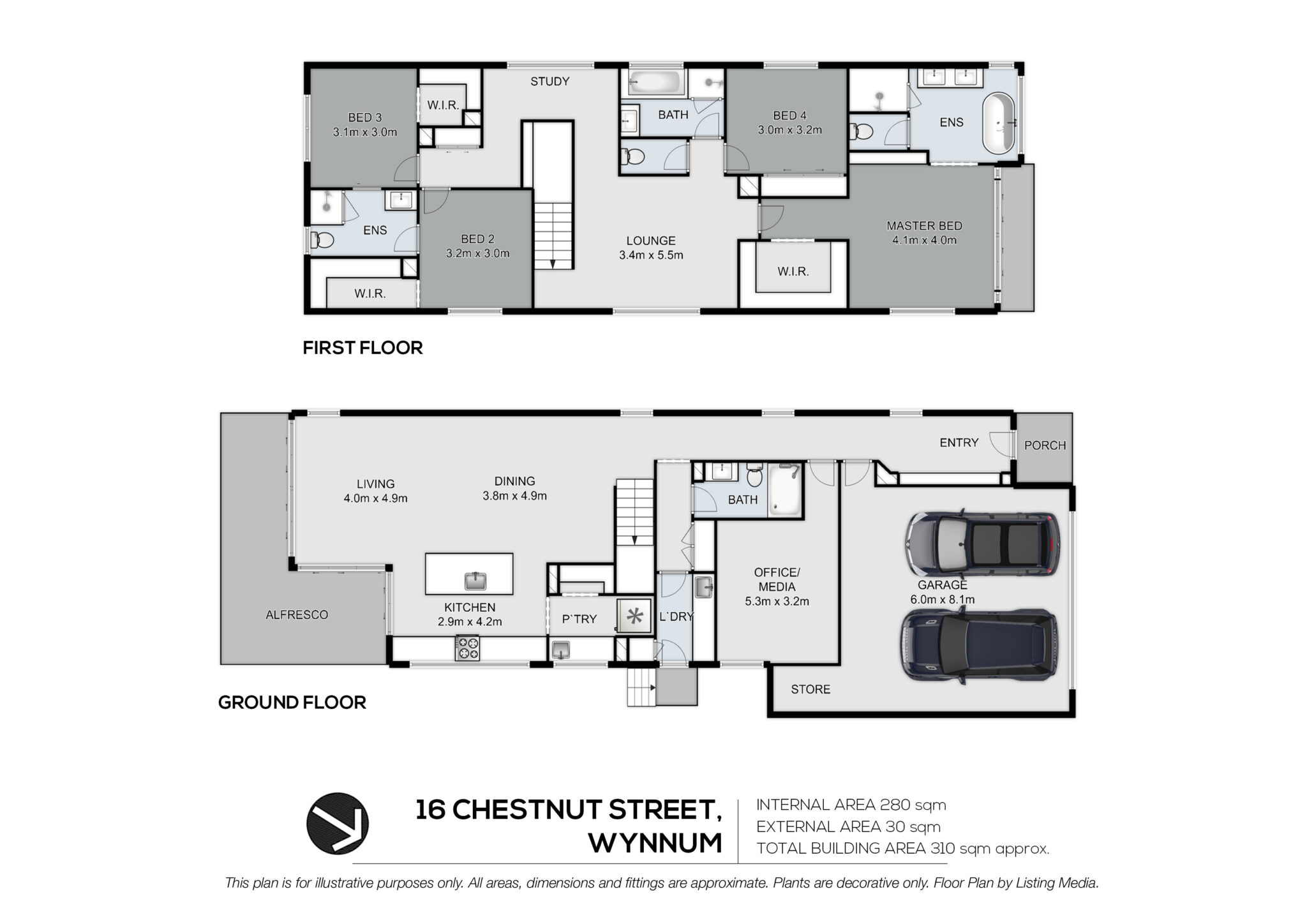 On the property’s entry level, a spacious open-plan living and dining area is bathed in natural light. Entertainers and avid cooks alike will appreciate the residence’s fantastic kitchen, which displays stainless-steel appliances, a breakfast bar, stone benchtops, pendant lighting, butler’s pantry and plentiful cupboard storage. Flowing from the living area is a covered rear alfresco area that leads to a fully fenced grassed rear yard. Finishing the lower level, a guest bedroom/media room, fourth bathroom and laundry.