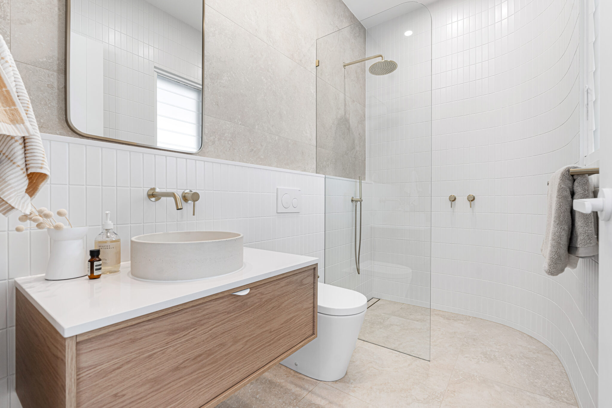 Contemporary elegance continues across the five bedrooms and four luxe bathrooms each finished with premium fixtures. Three bedrooms grace the lower level, including an ensuited guest bedroom while the upper level offers two bedrooms including the sublime, master suite with high ceilings, designer wet room ensuite and walk-in robe with skyline vistas.