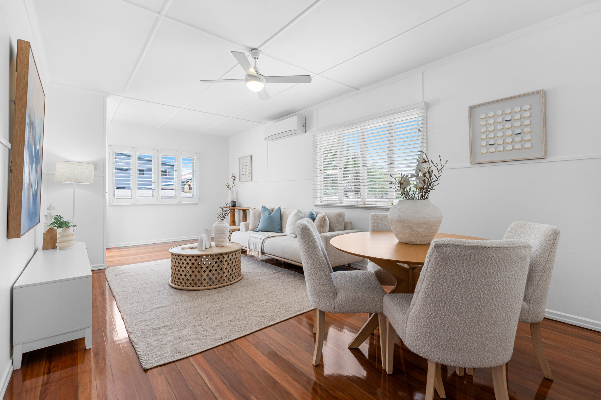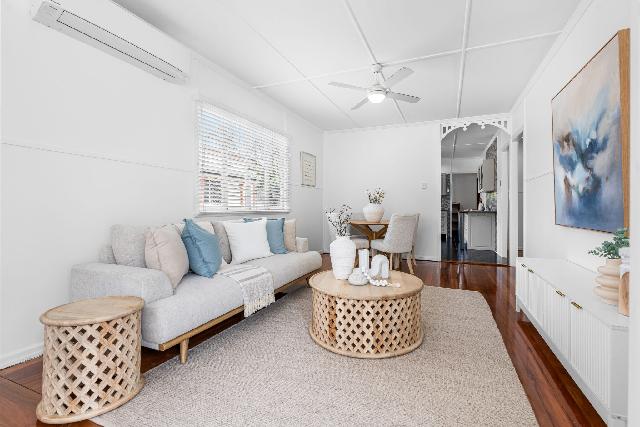 · Bright living area with polished floorboards, 7Kw air conditioner and ceiling fan