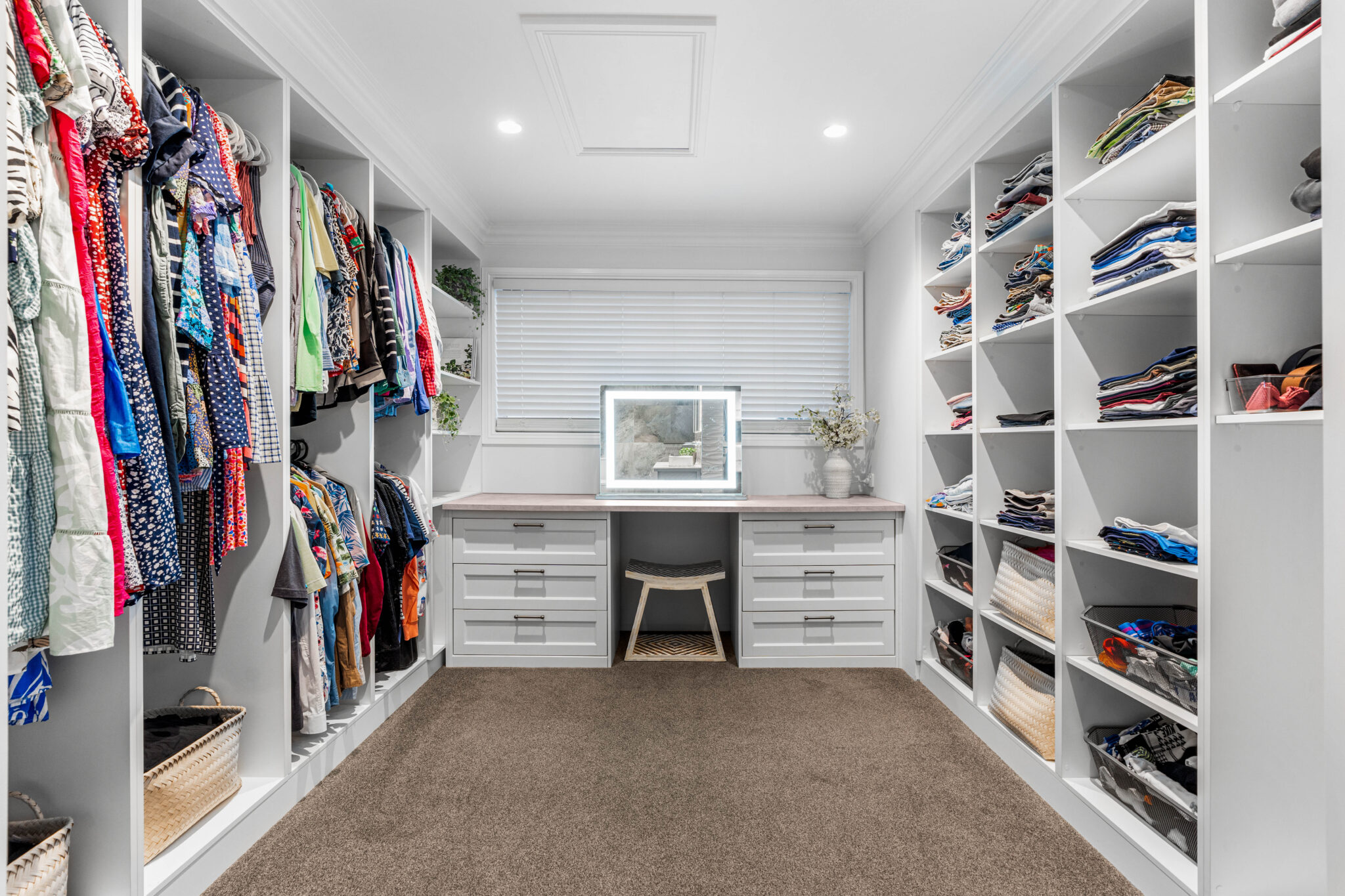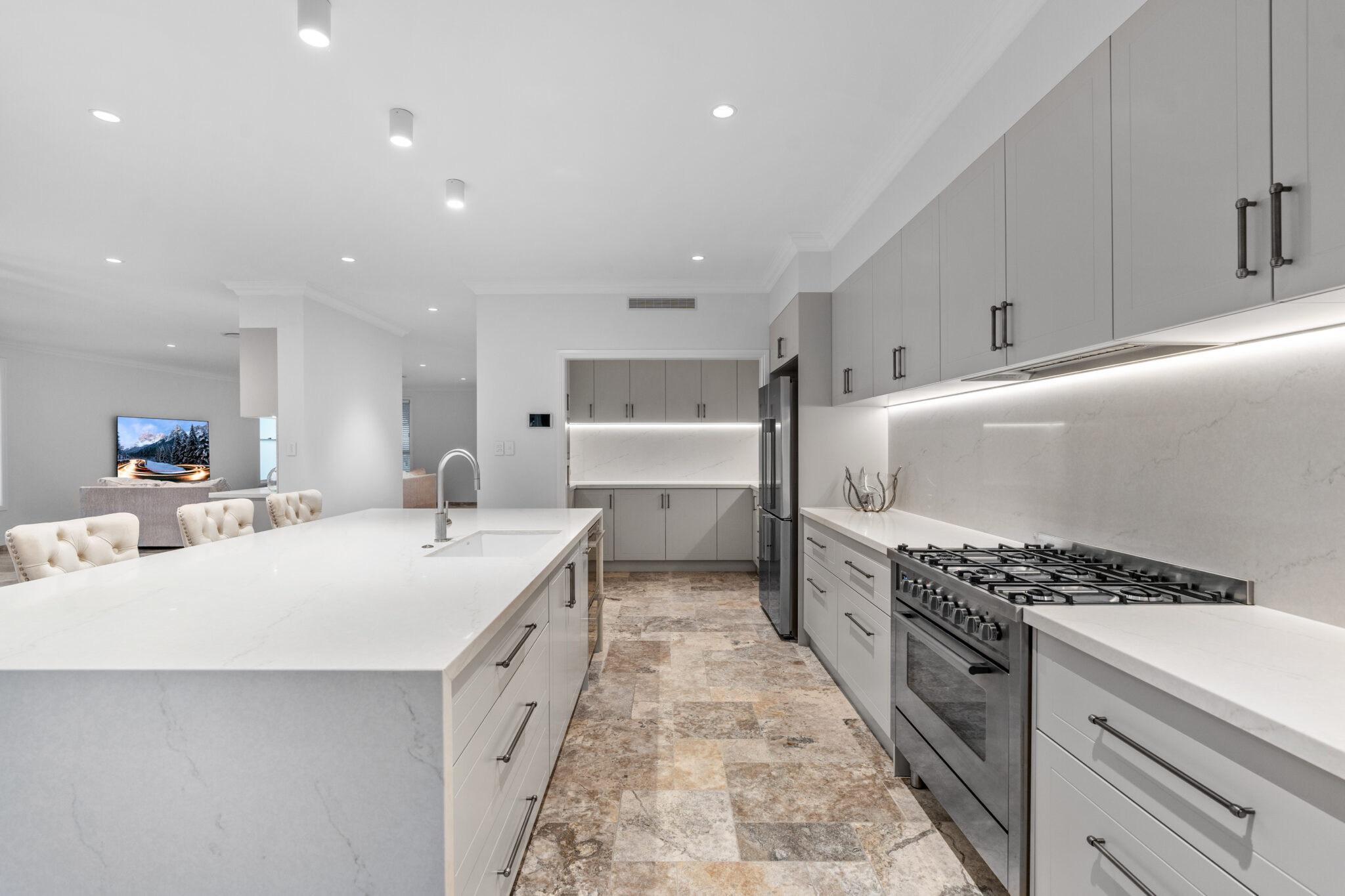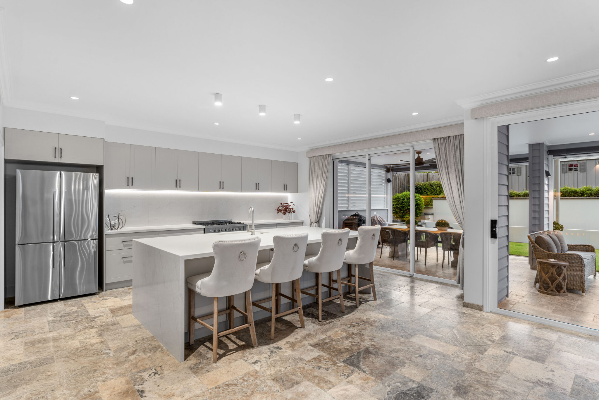 The kitchen has been expertly appointed with a 3m waterfall edge island, 900mm Ilve freestanding cooker, built-in Ilve microwave, F&P twin draw dishwasher, shaker-style Polytech cabinetry, and a butler’s pantry.