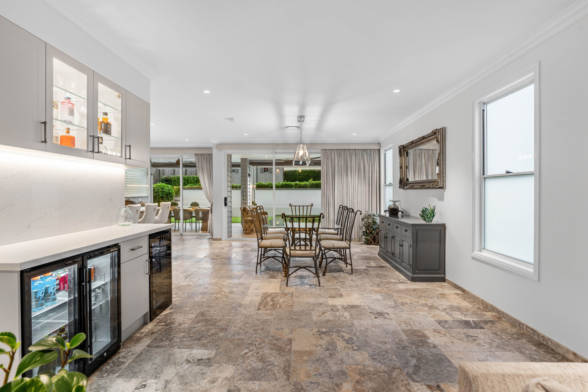 Open expanses integrate living and entertaining, with a sweeping indoor/outdoor plan connecting the kitchen, lounge/dining space, alfresco terrace, and open bar with bar fridge and wine cooler.