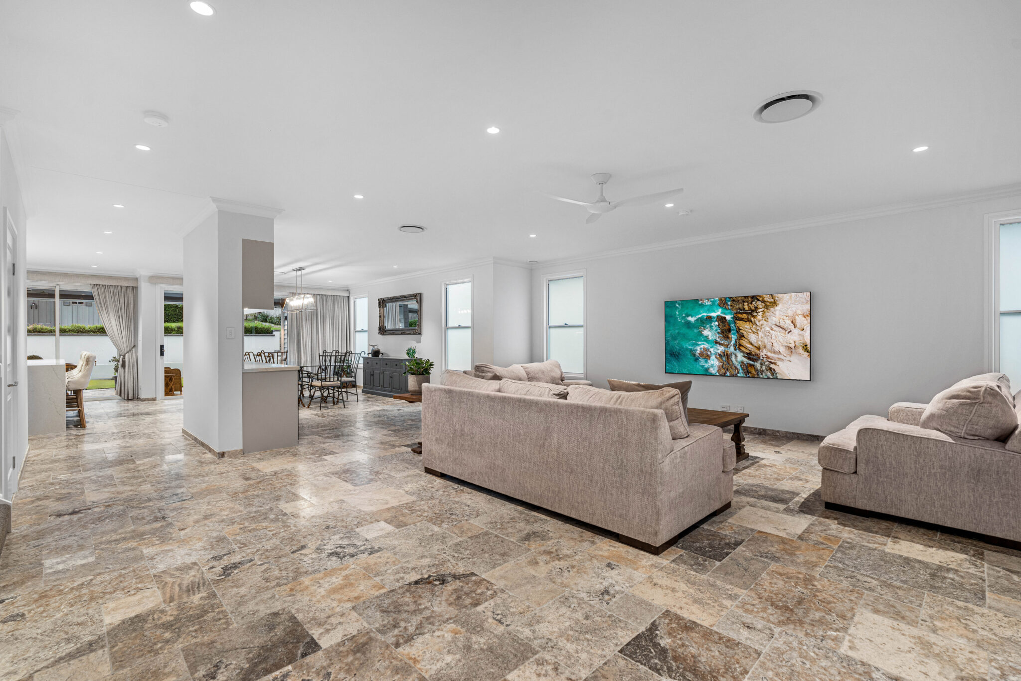 The commanding interiors unveil a dramatic sense of space with ceilings reaching 3.8 metres upon entry and 2.7m on the lower level. Creating richness and texture across the alluring architecture, a beautiful blend of lush thick carpets to all four bedrooms, while the lower level including the 4th bathroom, kitchen and living area have French pattern travertine natural stone flooring from turkey which follows through to the outdoors giving to true sense of connectivity.
