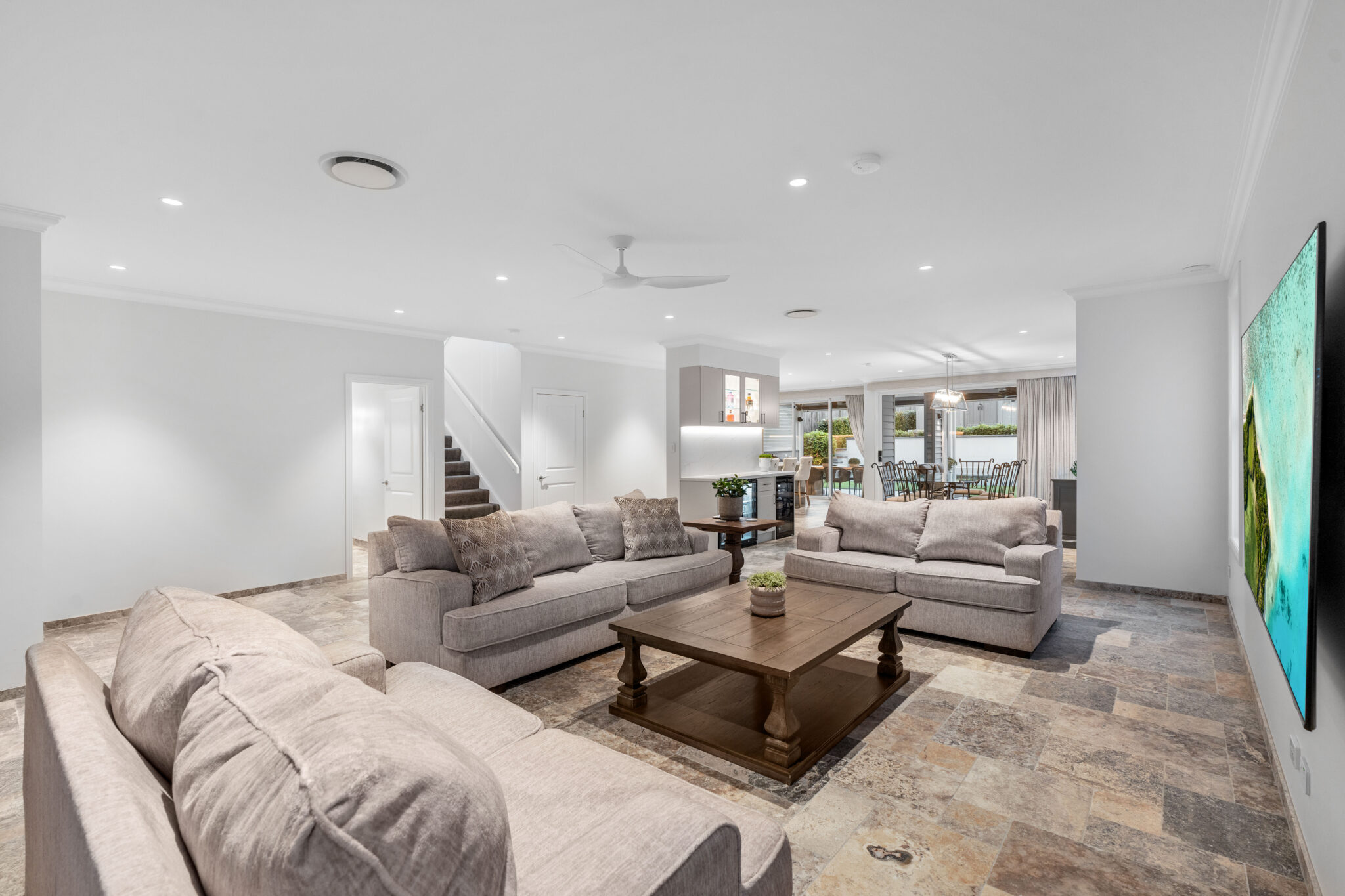 Versatile downstairs living with retractable sliding doors that open to a large undercover entertainment area with industrial style fans for summer and mounted heaters for winter, this area is also plumbed and ready for an outdoor kitchen.