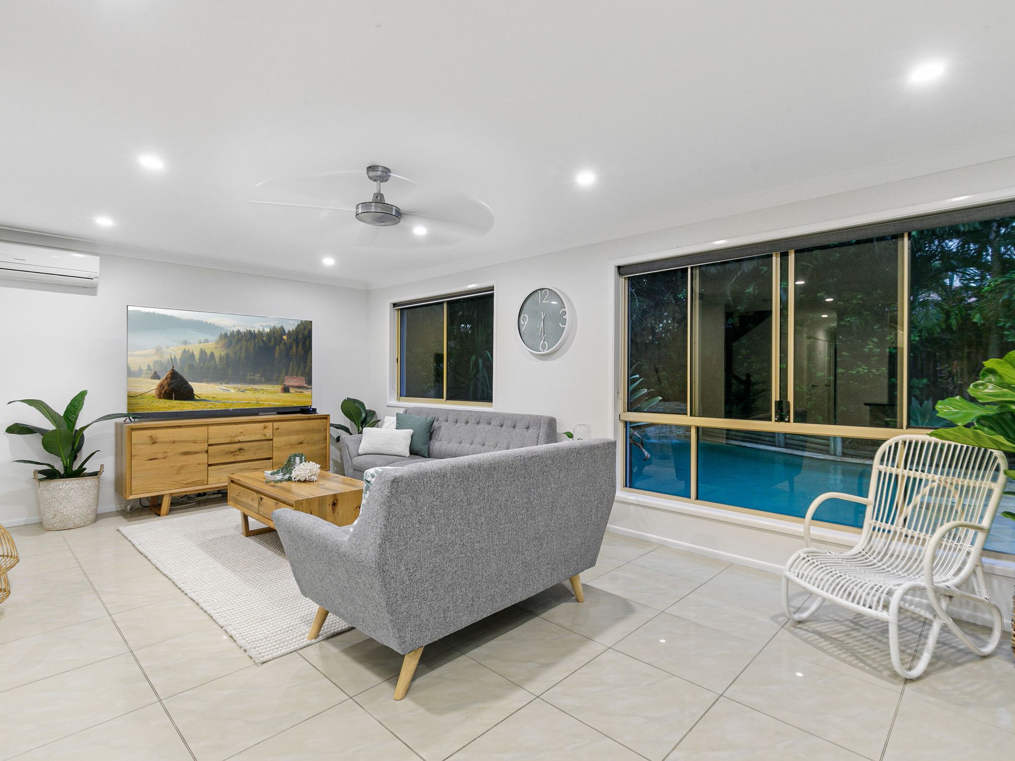 The rear of the home has large format windows and glass stacking doors stretching the full width which draw in the serene views of the tropical backyard and pool. You may be cooking dinner but you will feel like you’re on holiday at home with such a relaxing backdrop.