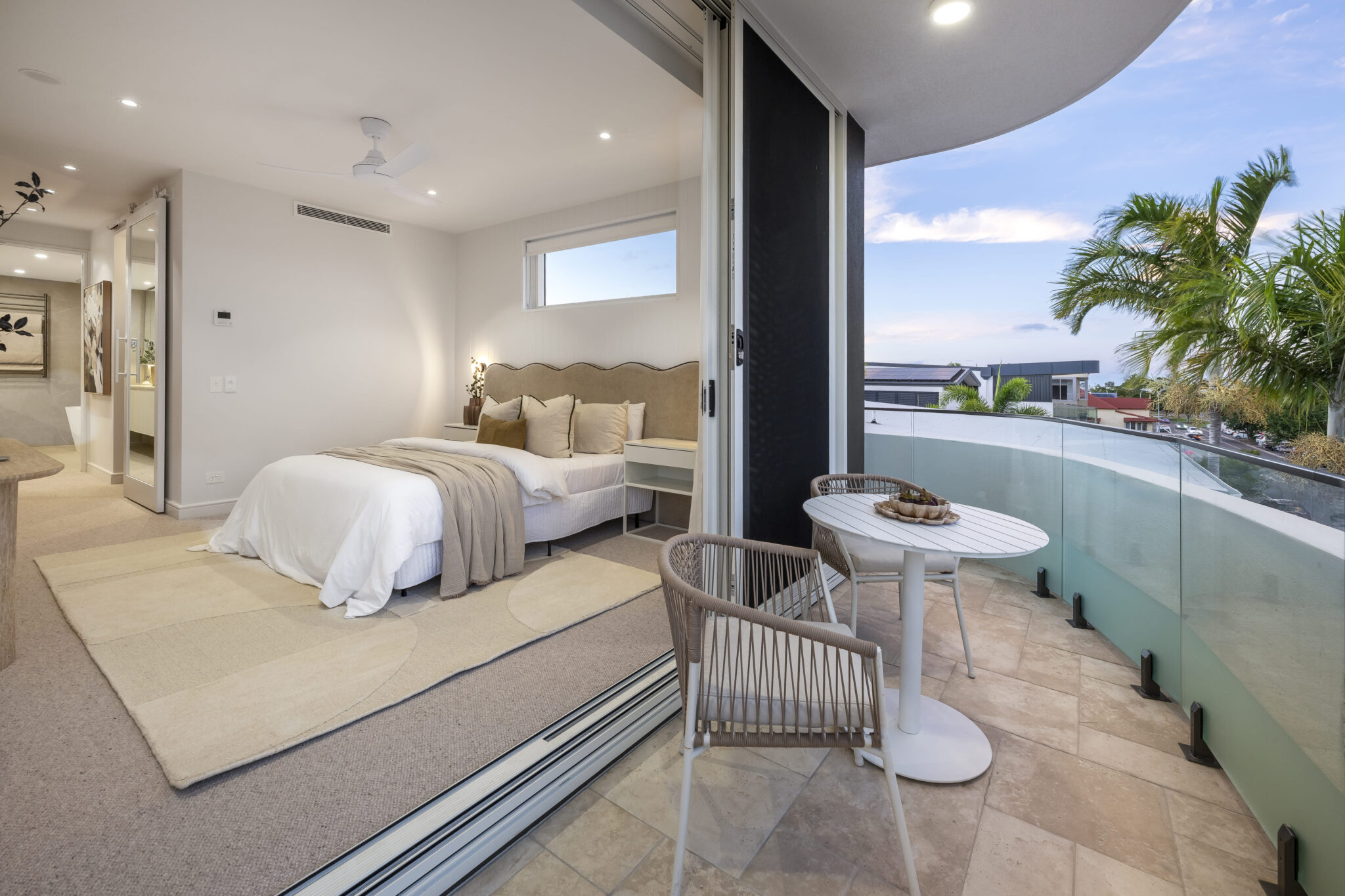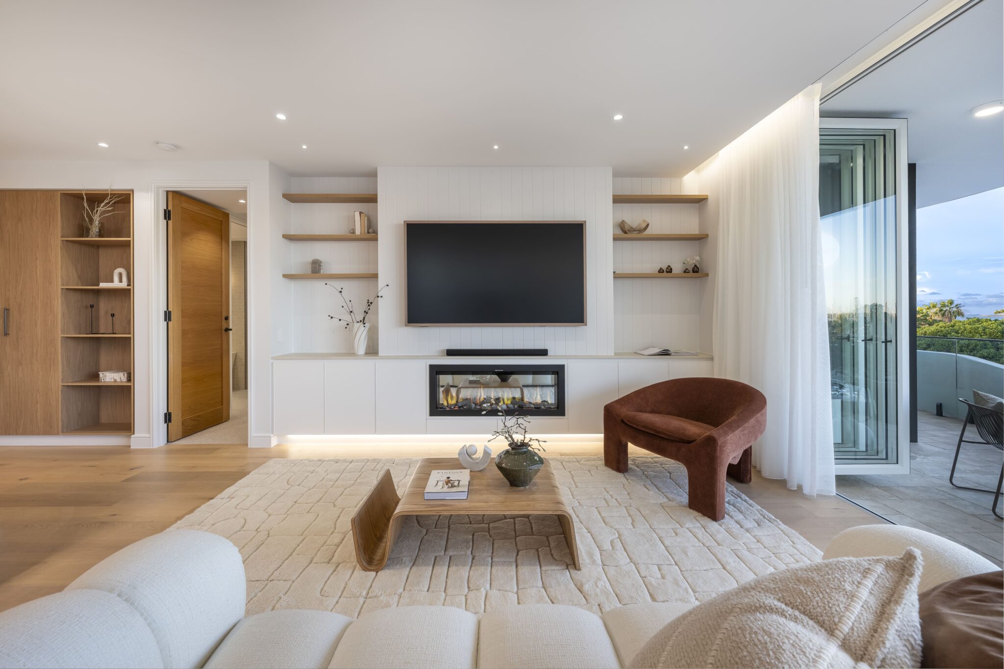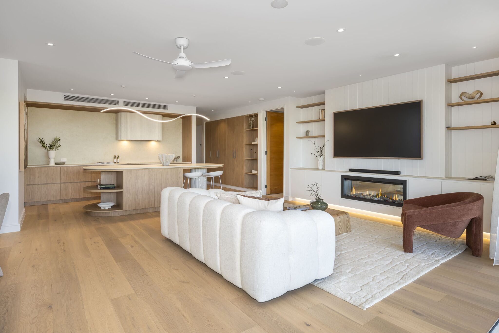 At the heart of the home is a gourmet kitchen with striking stone surfaces, a bespoke integrated sink, premium Miele appliances and a fully equipped butler’s pantry flows seamlessly into the vast open-plan living and dining domain. An elegant integrated bar with wine fridge and a feature fireplace create the perfect setting for refined entertaining. Step onto the protected alfresco balcony and savour sunset cocktails overlooking the water, orgreet the dawn with an espresso against a breathtaking, ever-changing coastal backdrop.