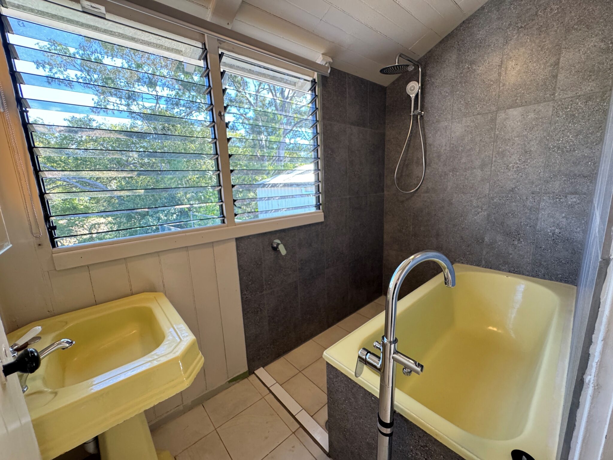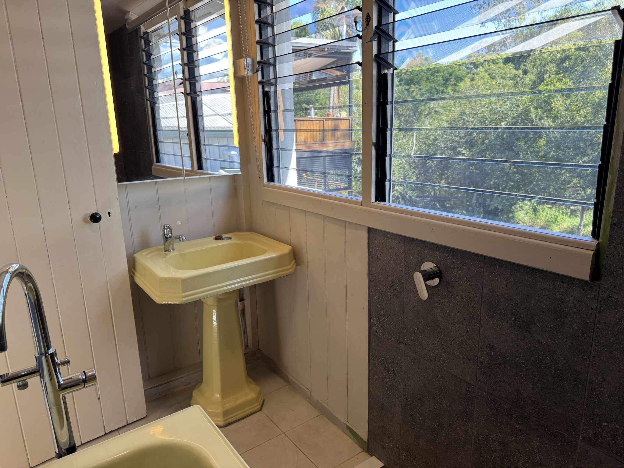 • Funky bathroom with a yellow bathtub and vanity, plus a serene outlook over the creek