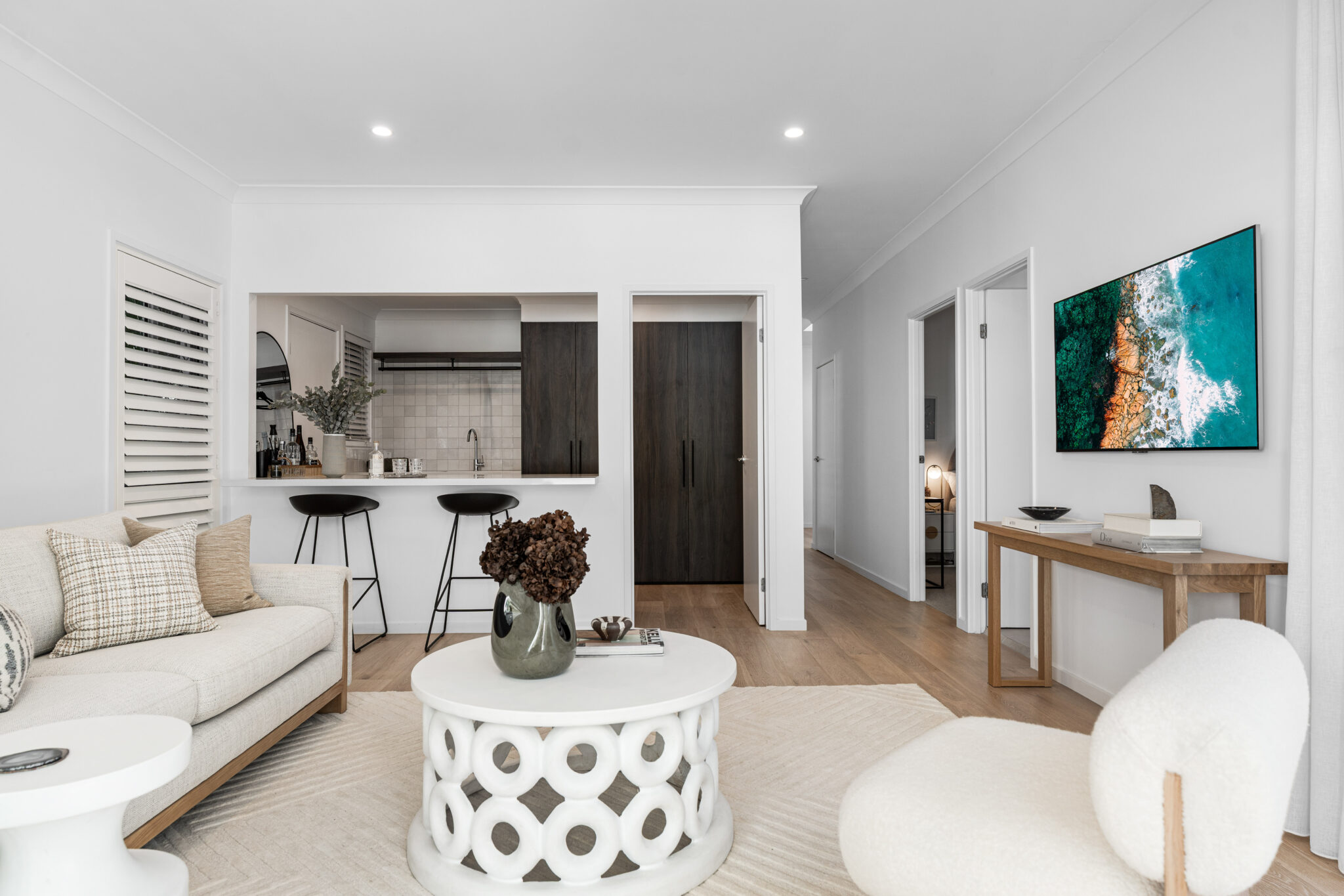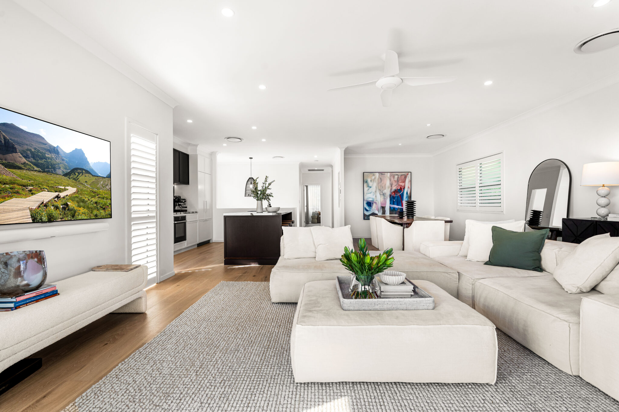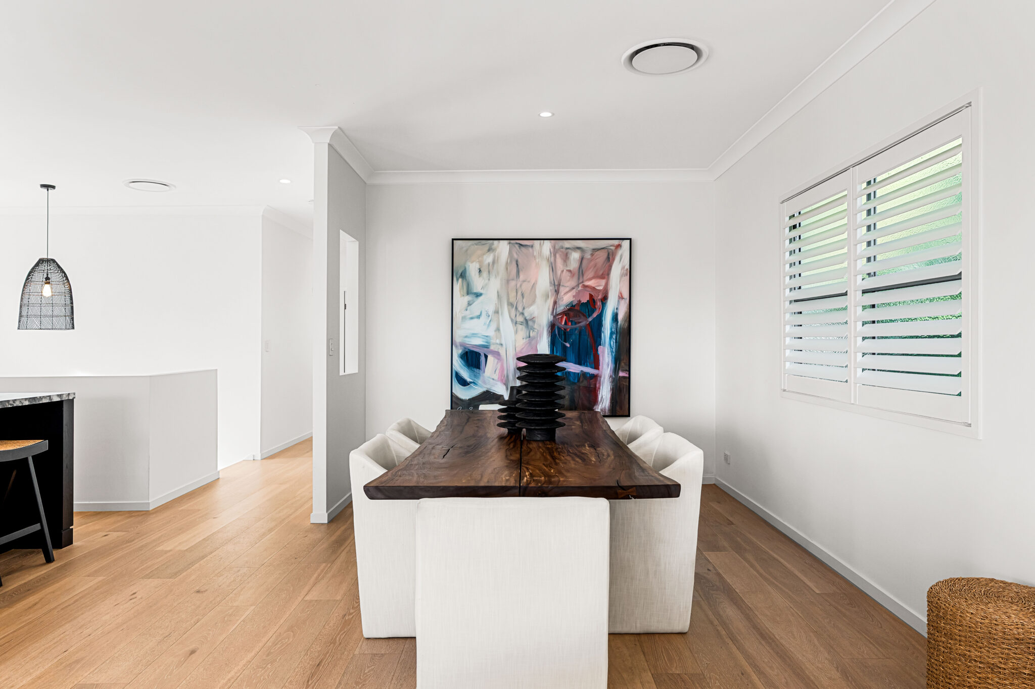 Inside, the design speaks of quiet luxury. The home’s linear layout and high ceilings (up to 5.4m in the stair void) enhance the sense of space, while engineered Smokey Grey timber flooring, sheer curtains, and timber shutters complement the soft, neutral palette throughout.