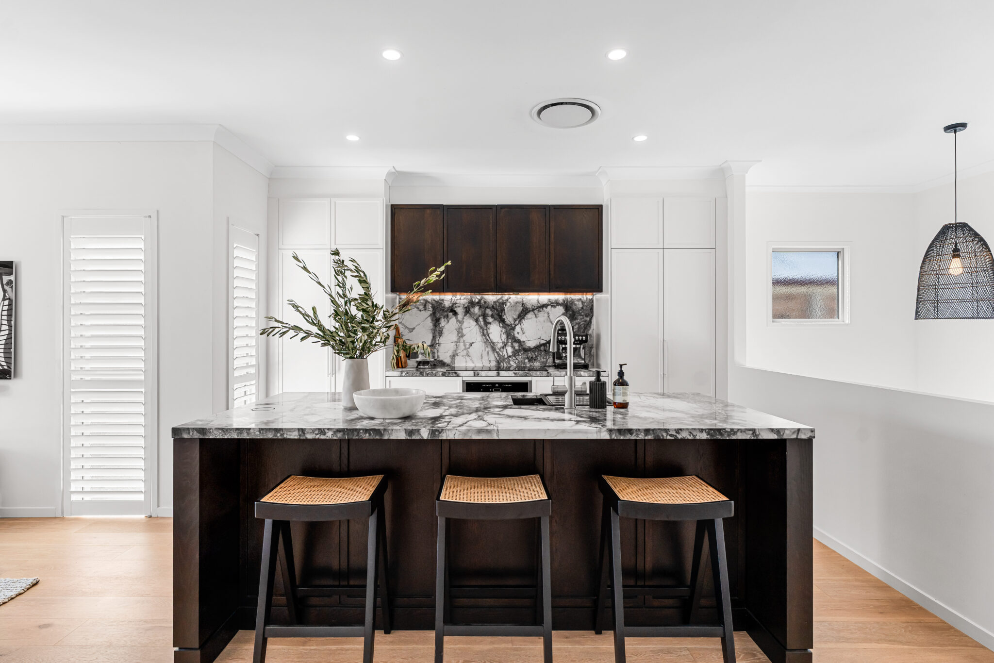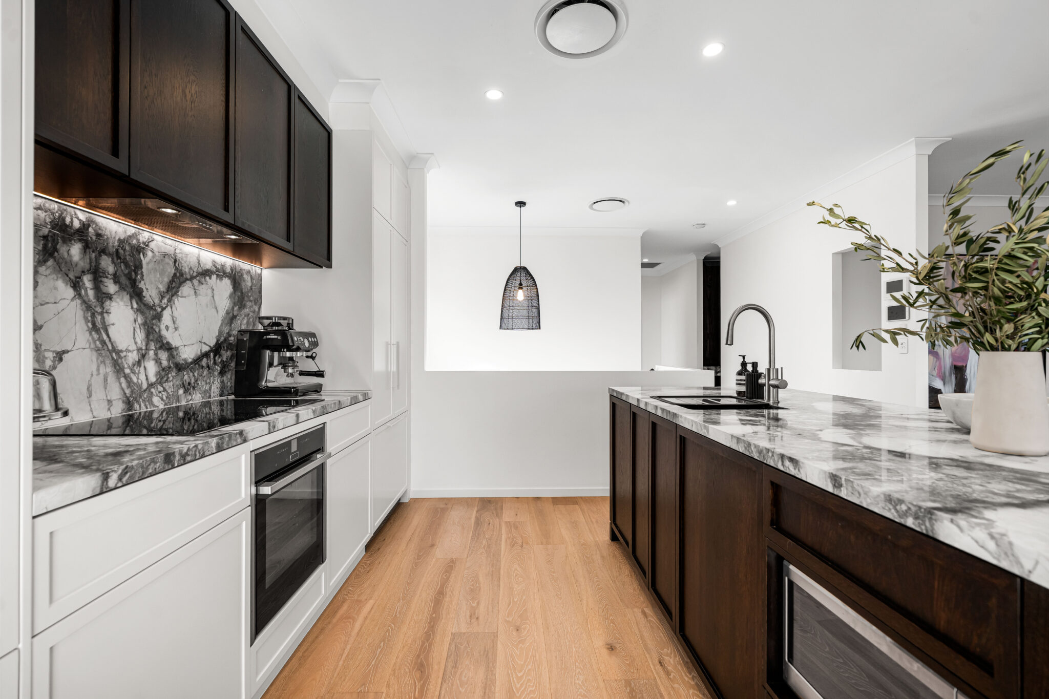 The gourmet kitchen is a showstopper, anchored by Iceberg Cote D’Azur benchtops from Signorino with 40mm mitred edges and a bookmarked splashback. Custom joinery in American Oak (Brown Japan stain to the island, 2PAC finish to surrounds) and premium