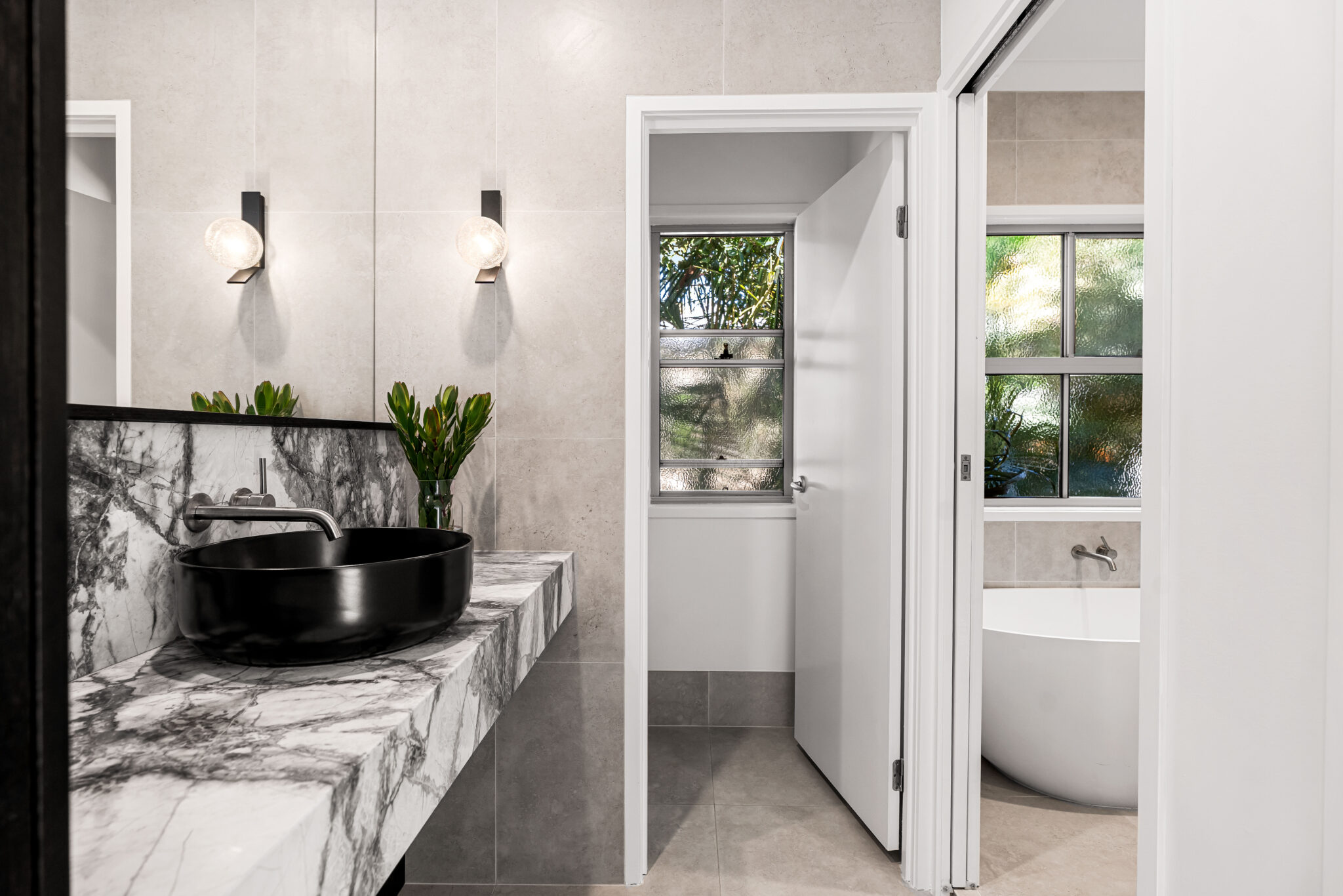 The accommodation is equally impressive. Four bedrooms and three luxe bathrooms, each finished with floating vanities, brushed nickel PVD tapware, and in-wall cistern toilets. The opulent master suite features a beautifully appointed ensuite with shower, vanity and toilet, and a custom-designed walk-in robe with elegant joinery. The main bathroom is a standout, boasting a freestanding bath that brings a sense of spa-like indulgence to the home.