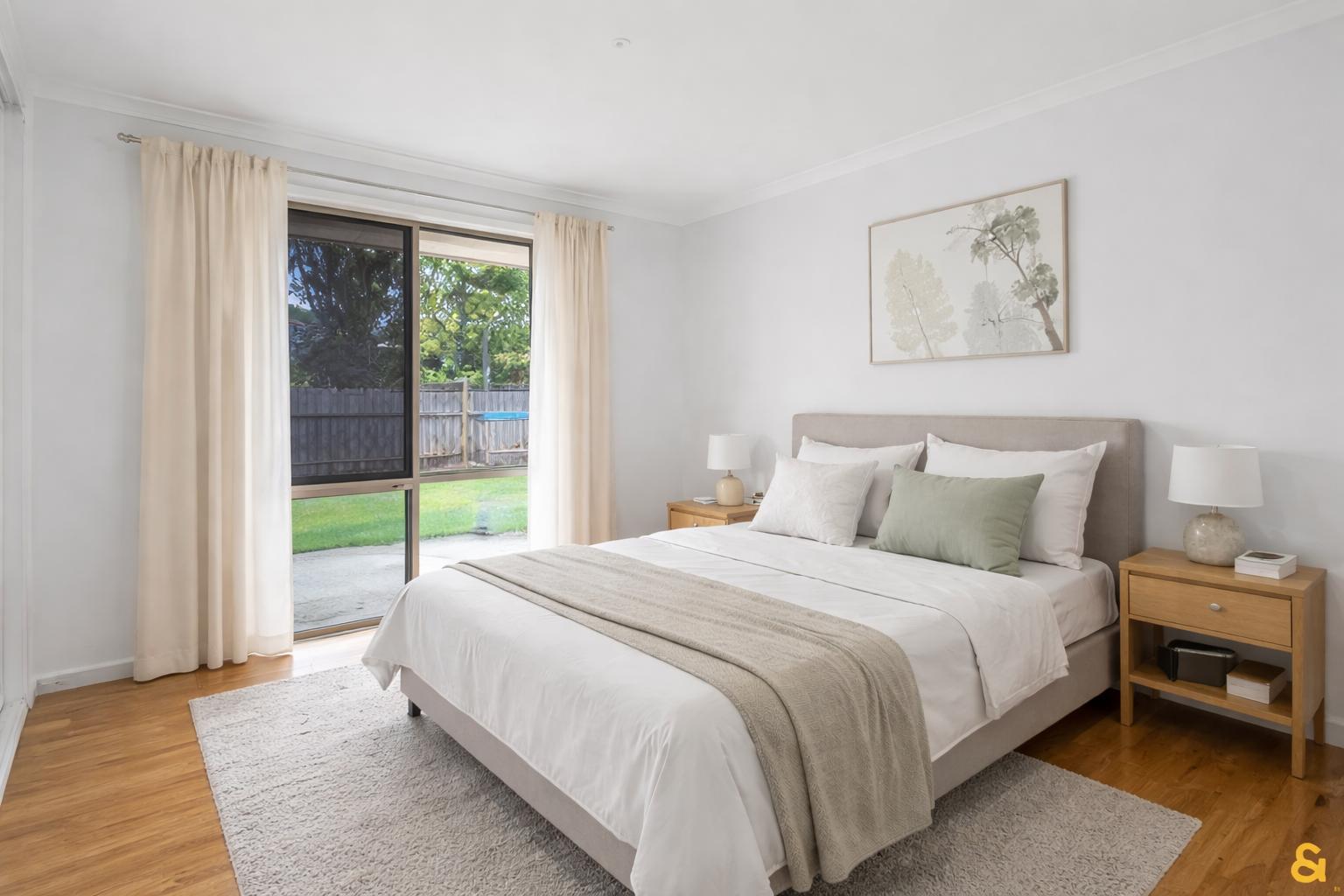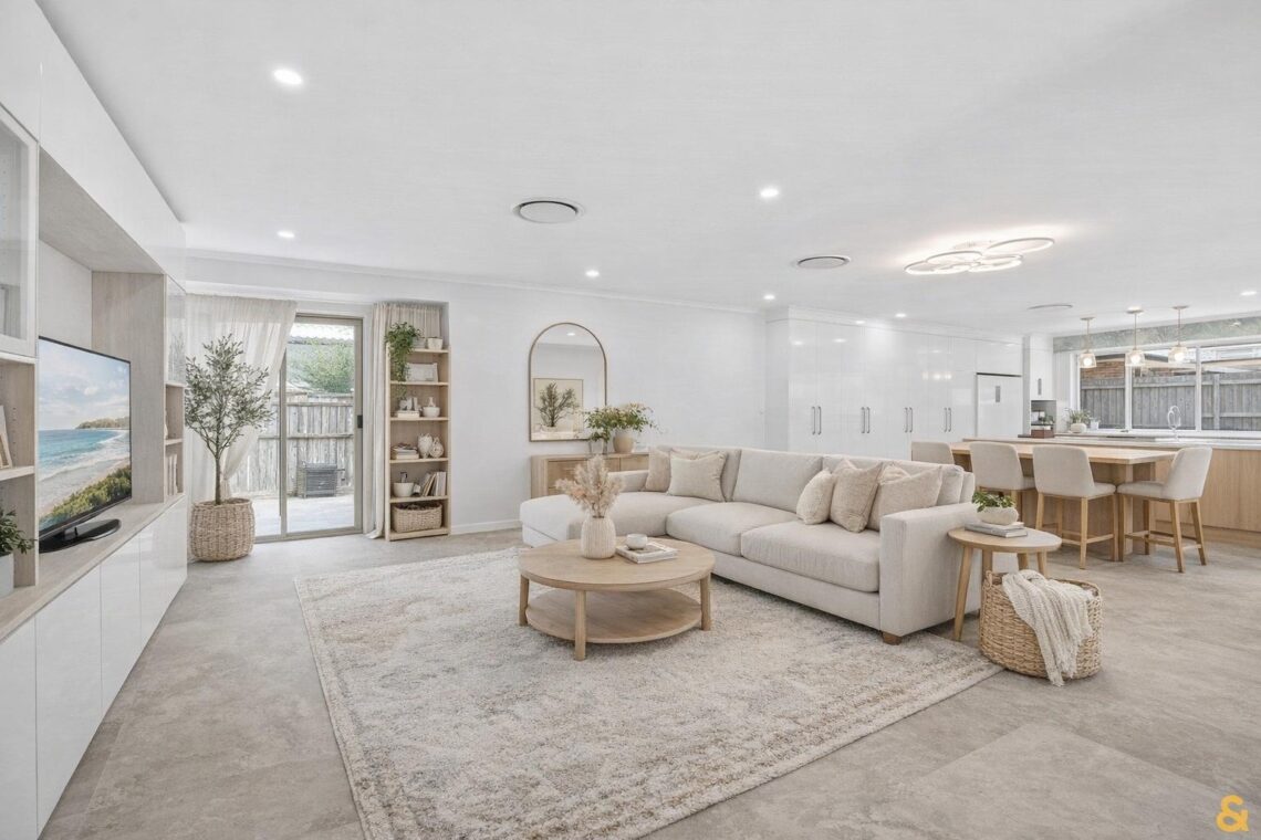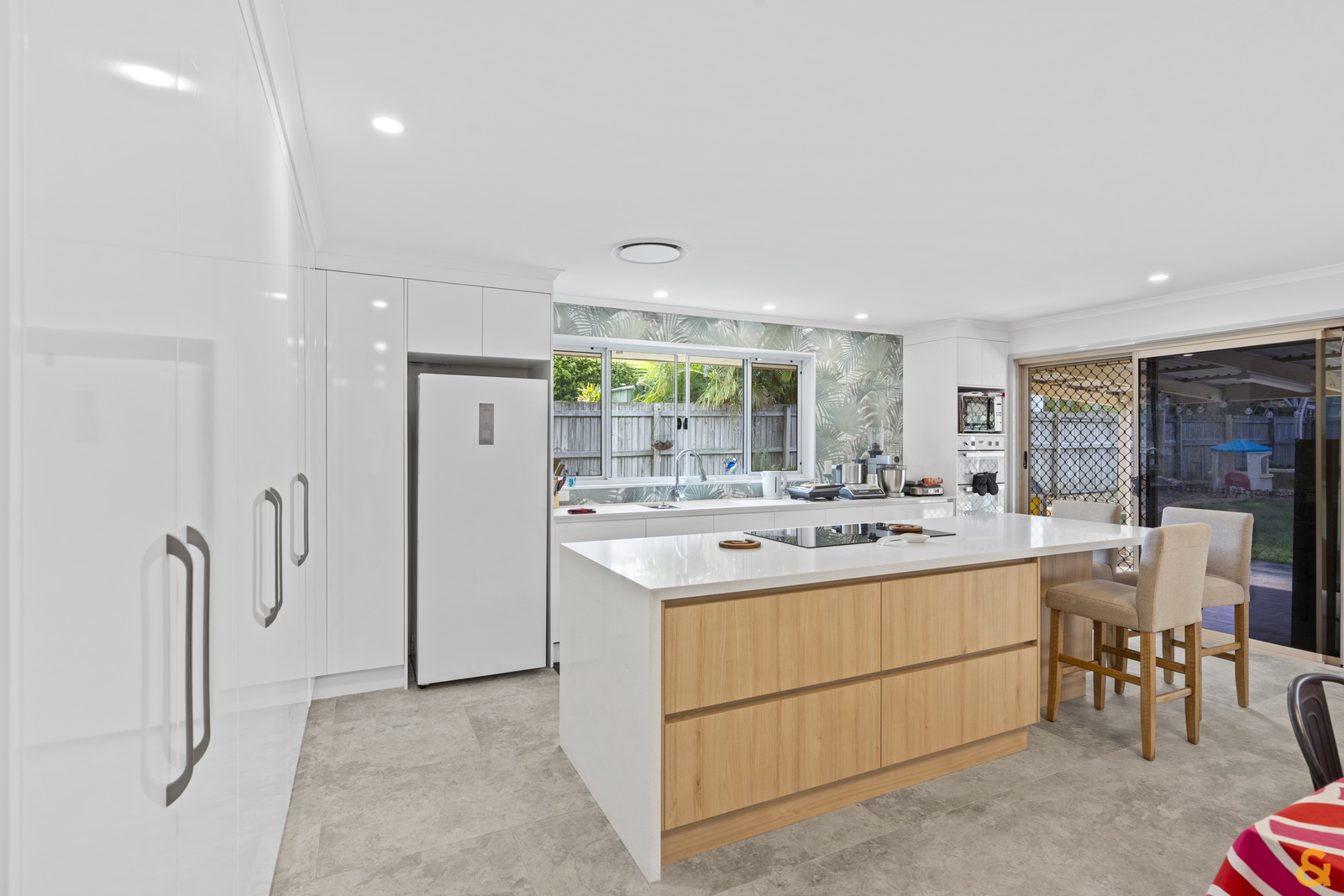 The contemporary kitchen is a chef’s dream, equipped with modern appliances and ample storage, and looks out onto a large outdoor entertaining area with an enormous back yard – equipped with a built in jungle gym!