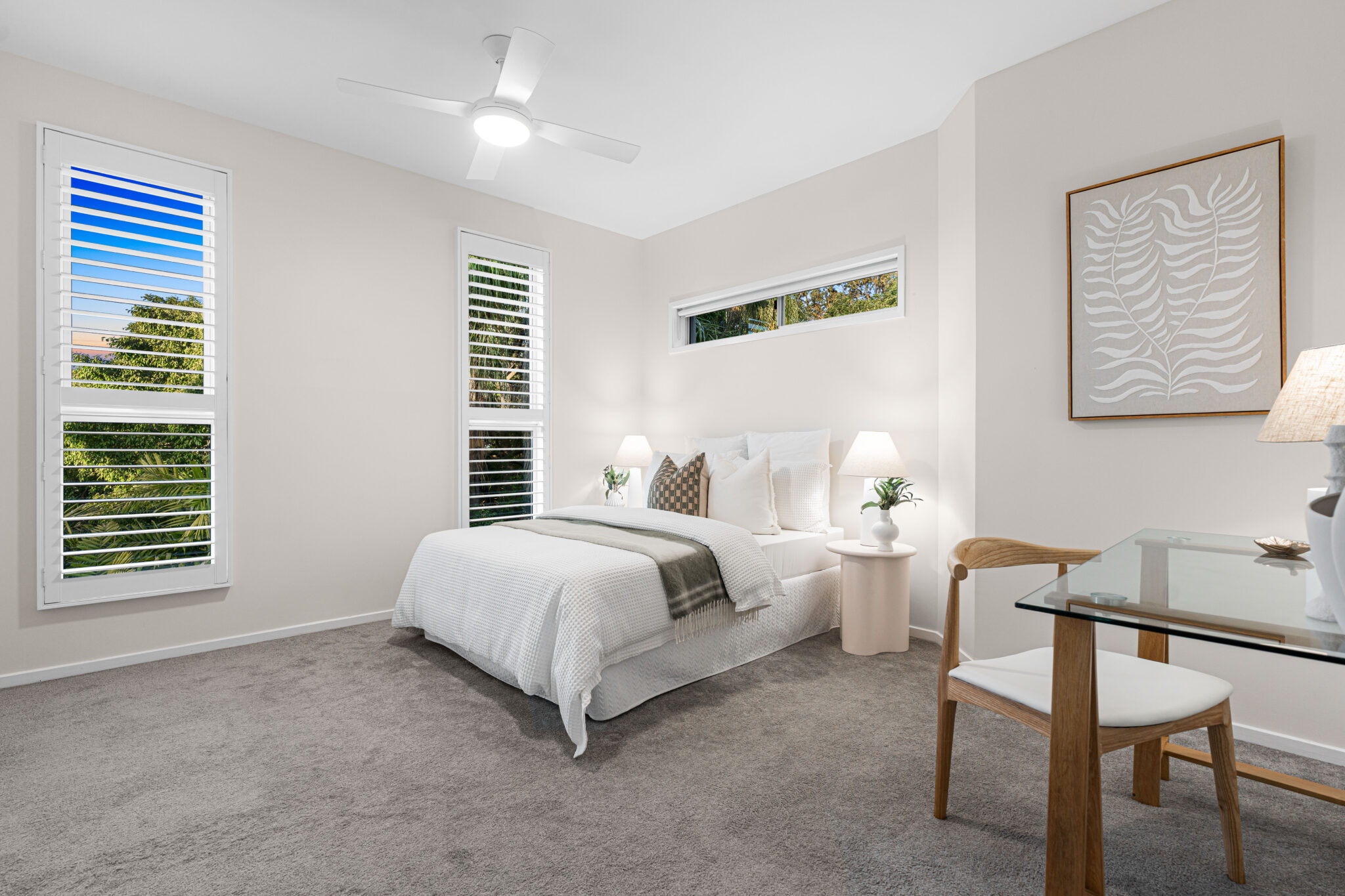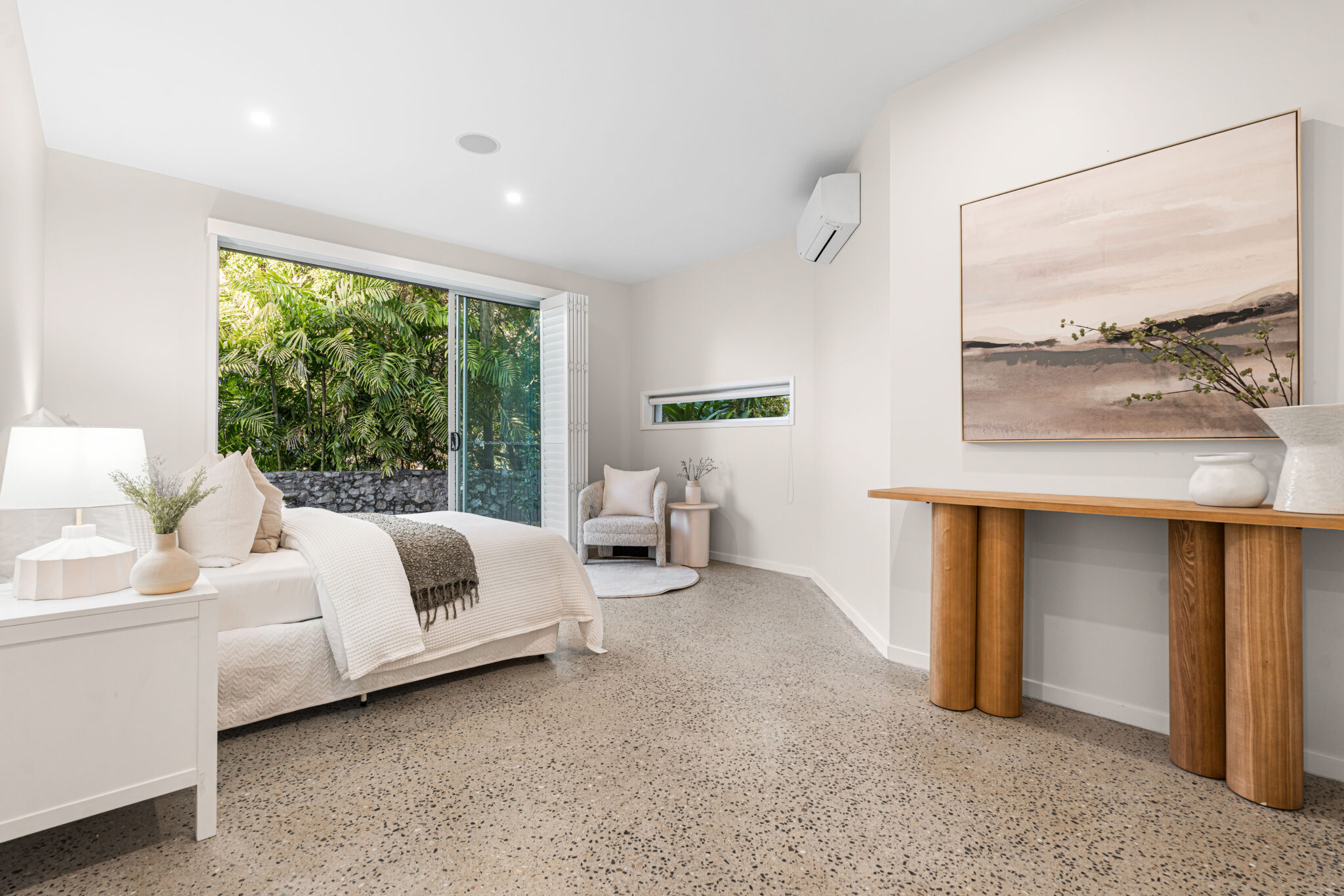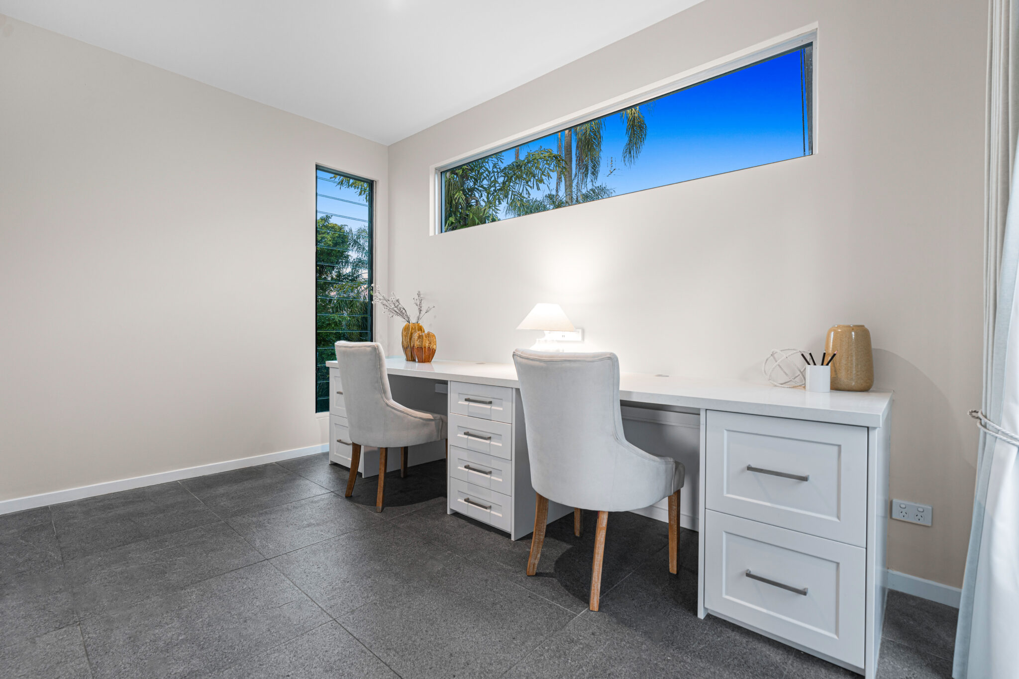 – Bright guest bedroom/study, polished concrete and tiled floors