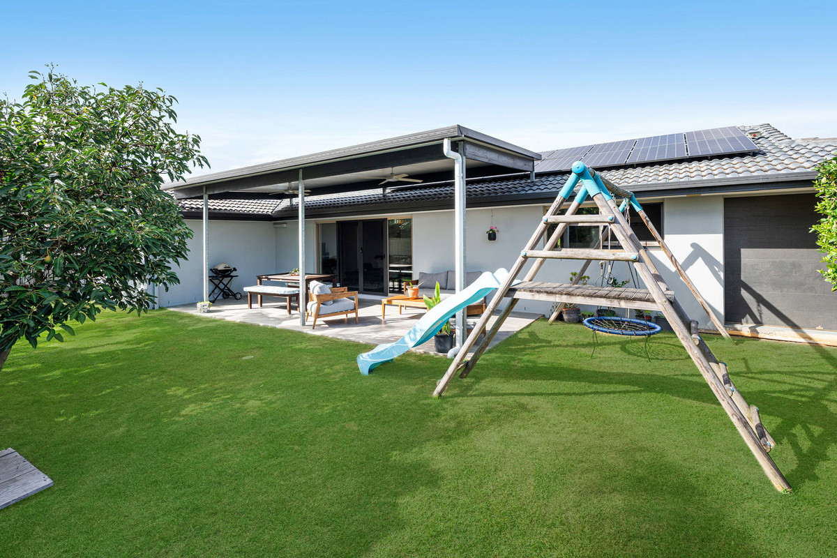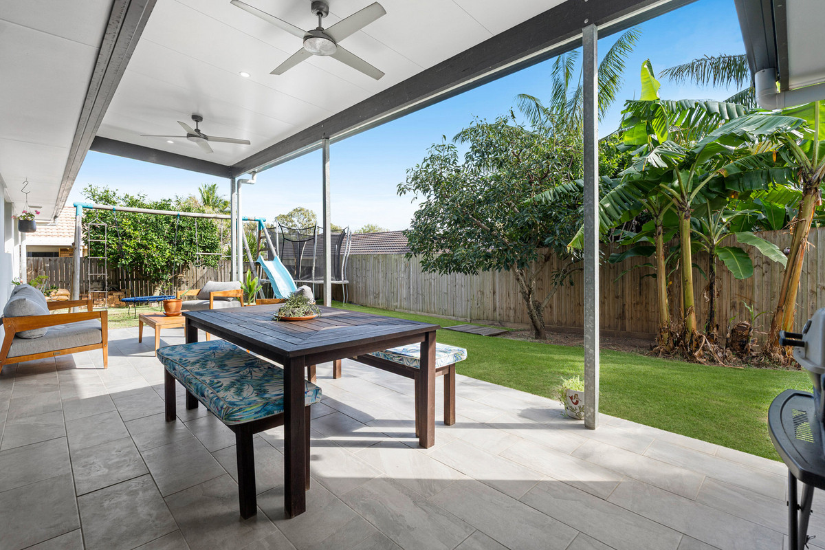 Extending seamlessly outdoors, the home embraces a private retreat, with an undercover patio overlooking a flat, family-friendly backyard. Designed for entertaining and everyday enjoyment, this alfresco setting provides ample space for children’s play, from swing sets to trampolines, while adults unwind or gather with friends.